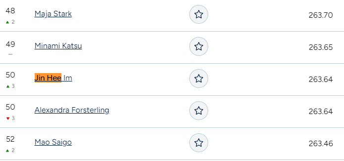 LPGA 루키 1년차인 임진희 프로는 KLPGA 투어 디펜딩 챔피언으로 미국과 한국을 오가며 강행군을 하고 있지만, 적응을 잘하고 있는지 성적은 나쁘지 않습니다. 16번의 대회에 참가하여 탑 10 피니쉬 3회, 최고 등수 공동 4위를 하여 2024.09.11 현재 수령상금액수 902,503$ 를 수령하며 상금 순위 24위에 랭크(세계 랭킹 47위) 되어 있고 신인상 점수도 사이고 마오 선수 뒤를 이어 2위를 달리고 있습니다. 내년까지 LPGA에 잘 적응하여 곧 우승 소식이 들려오기를 기대해 보겠습니다.