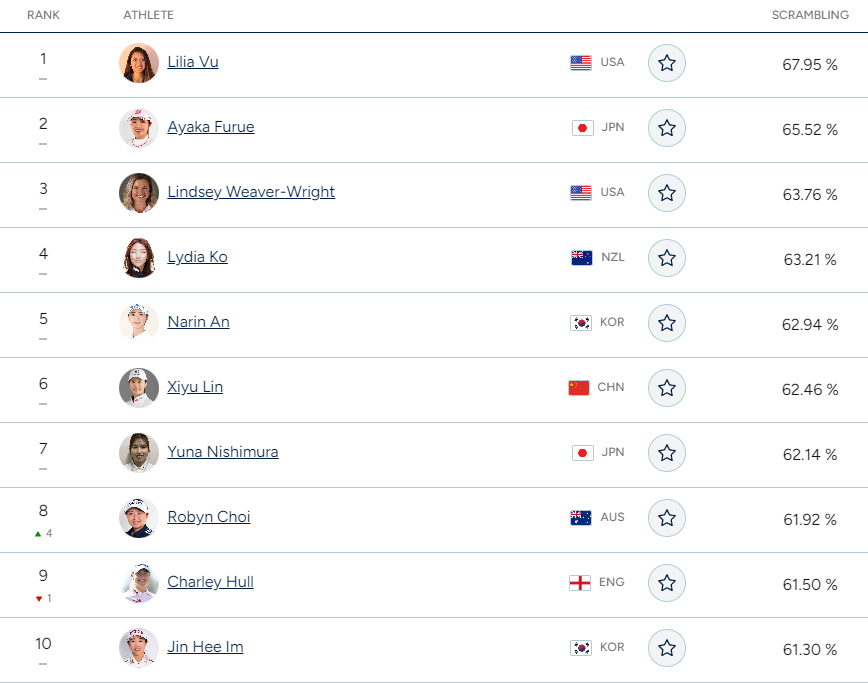 | 리디아 고 [21], 안나 노르드크비스트 [9], 이다연 [8], 셀린 부티에 [6], 김효주 [6], 다니엘 강 [6], 릴리아 부 [5],김수지 [5], 모리야 쭈타누깐 [3], 오스틴 에른스트 [3], 앨리 유잉 [3], 파티 타바탄나킷 [2], 방신실 [2], 노승희 [2], 최은우 [2], 난나 코어스츠 마드센 [1], 란 오툴 [1], 박주영 [1] |