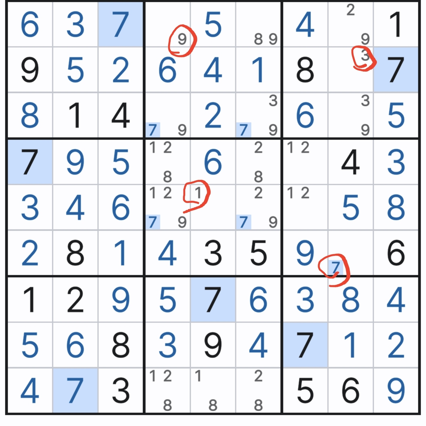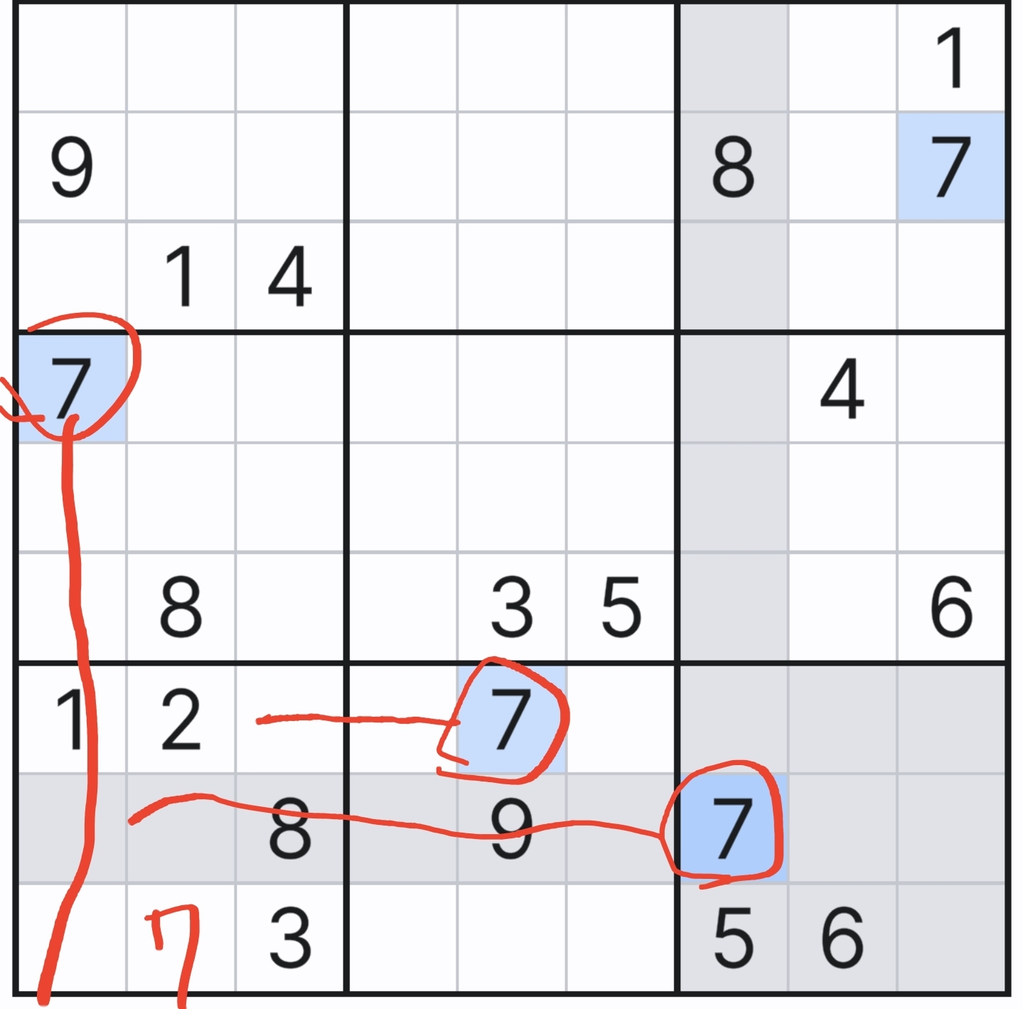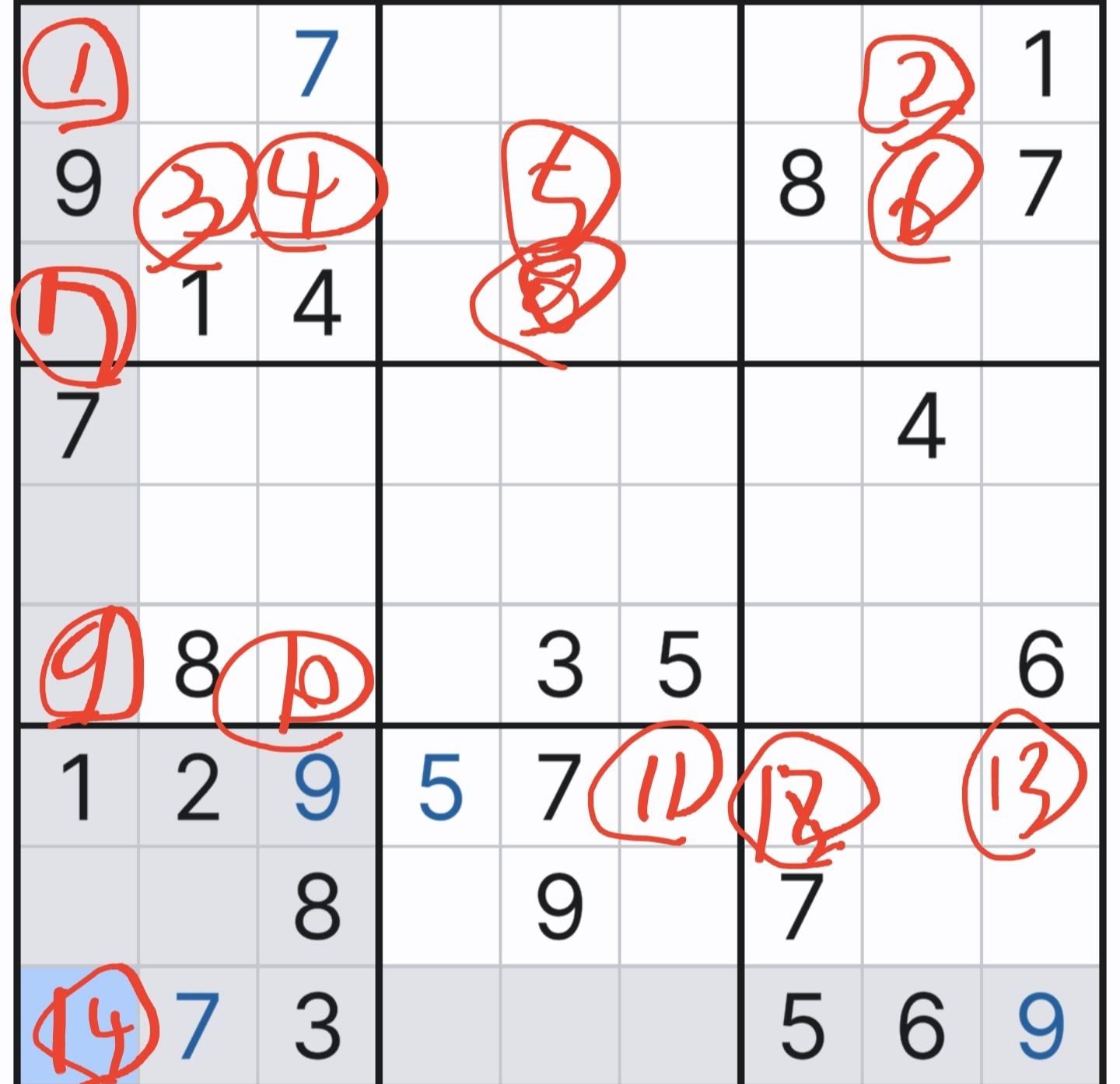 처음 찾은 7로 셀1에 들어가는 7을 찾았다. 초반에 이렇게 다이렉트로 들어가는 숫자를 많이 찾아야 중. 후반이 편하다. 그러나 난이도 조절로 2~4개 정도 나온다.