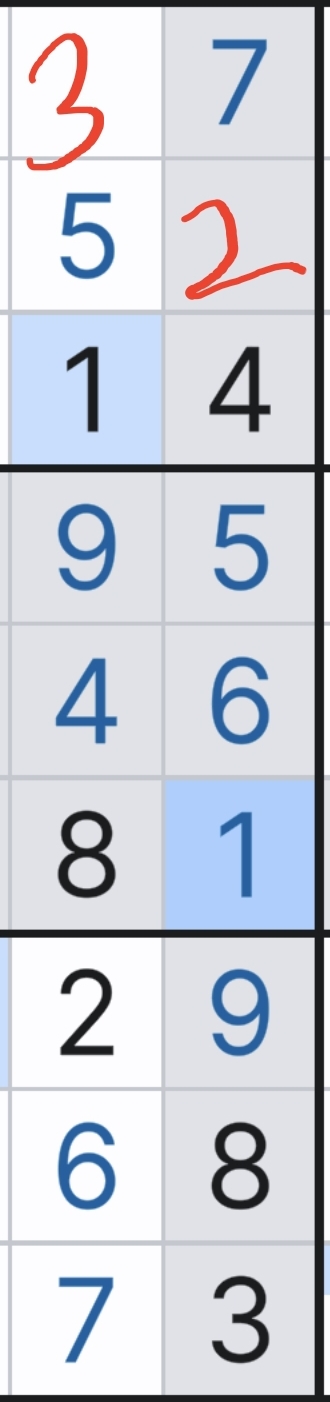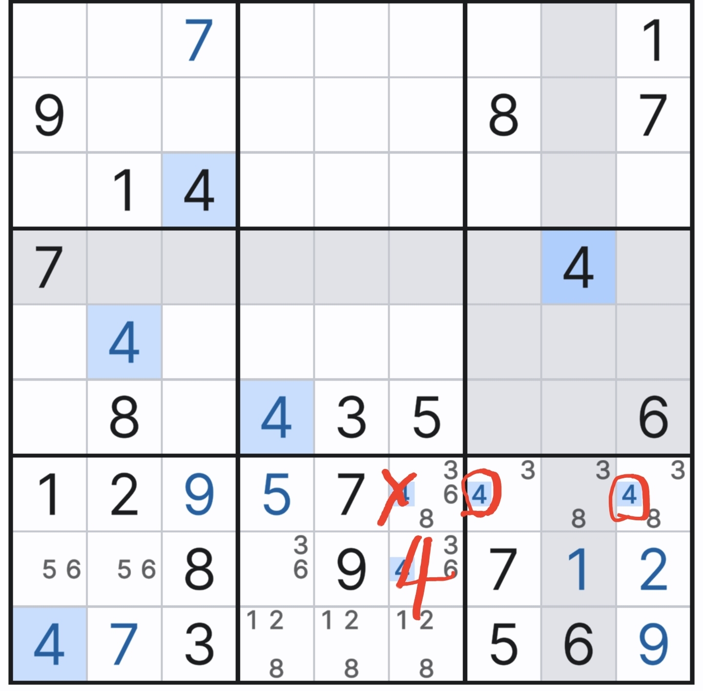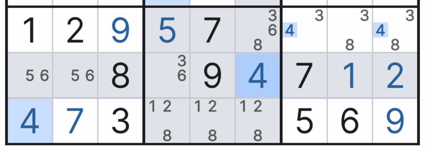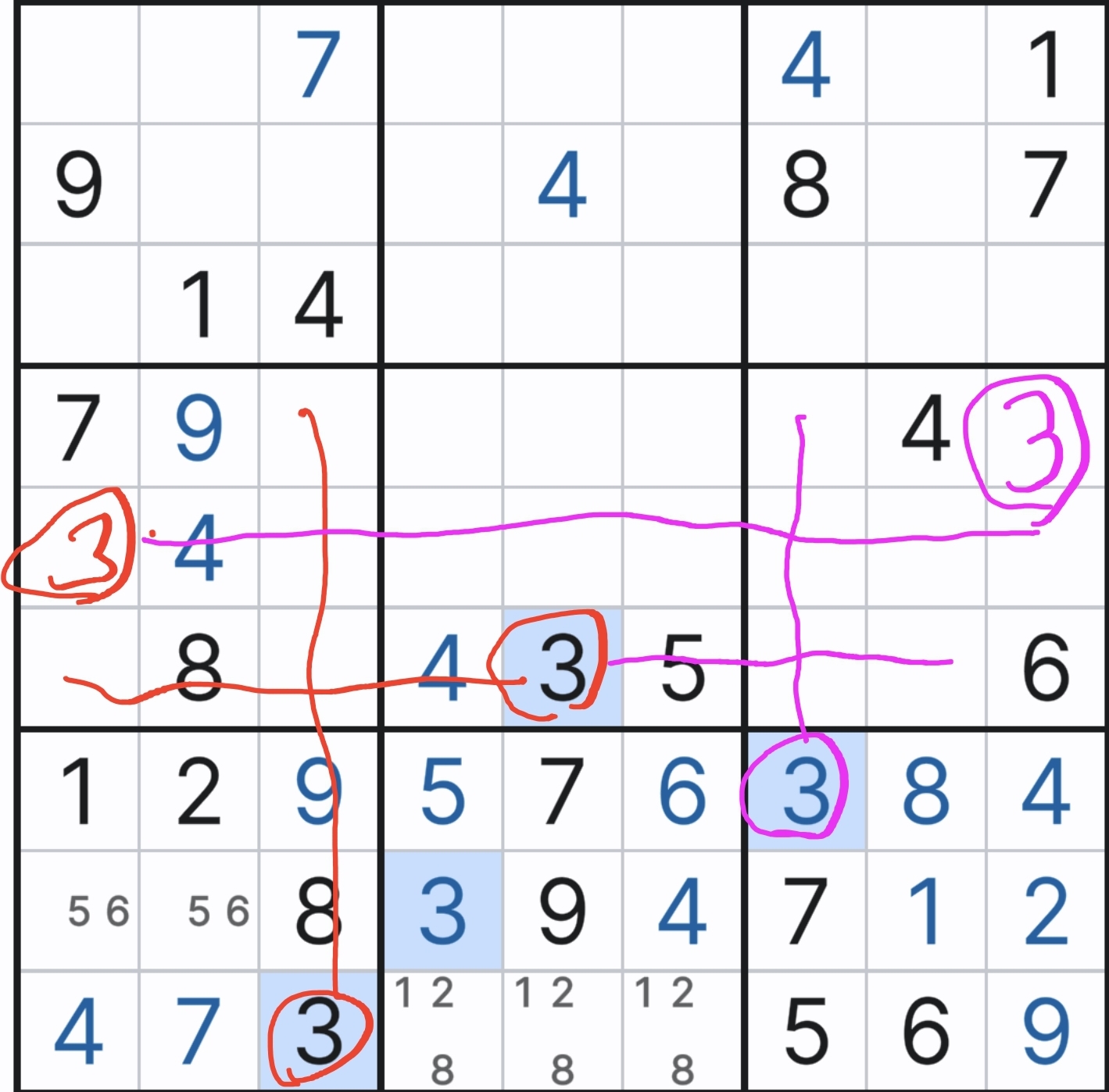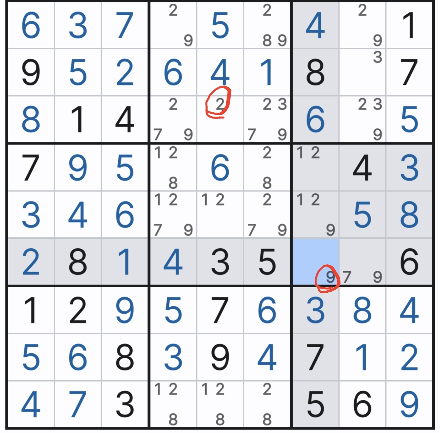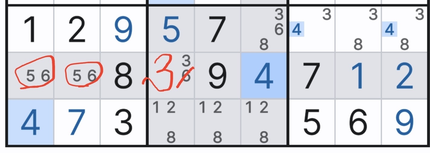 또한 연속되는 셀 3개는 모근 숫자가 겹치지 않고 3개씩 들어가야 하기 때문에 마지막 숫자 및 초반에 다이랙트 찾기로 놓친 숫자도 손쉽게 찾을 수 있다.