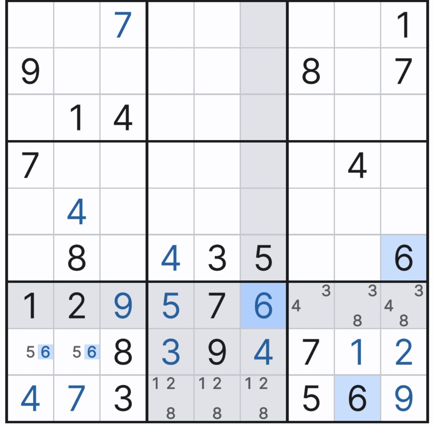 셀8의 G행에 연속해서 들어간 확실한 트리플' 후보숫자 1, 2, 8은 같은 셀 또는 행에는 올 수 없으므로 G6에 있는 8을 지울 수 있고 6이 들어가게 된다.