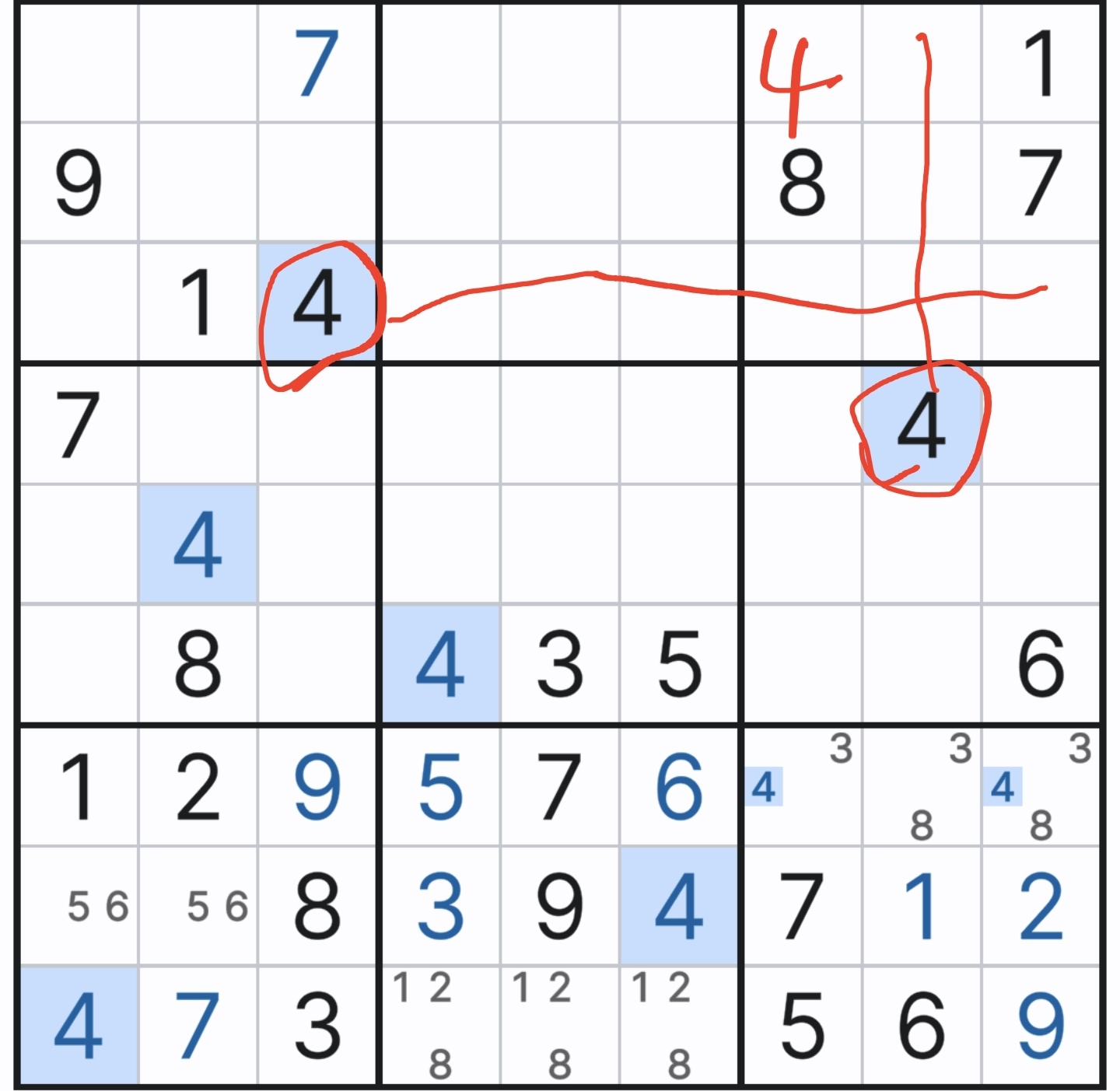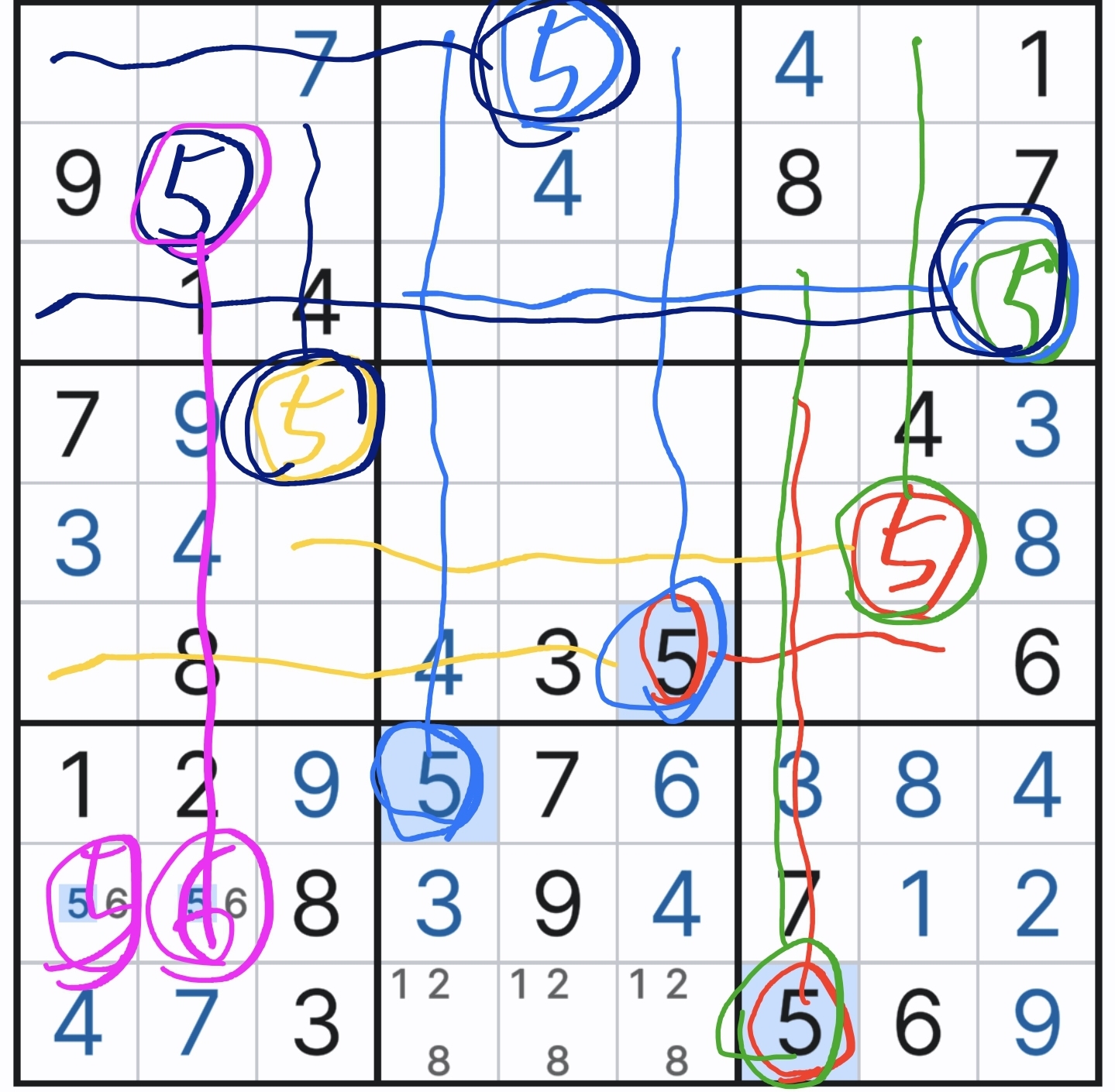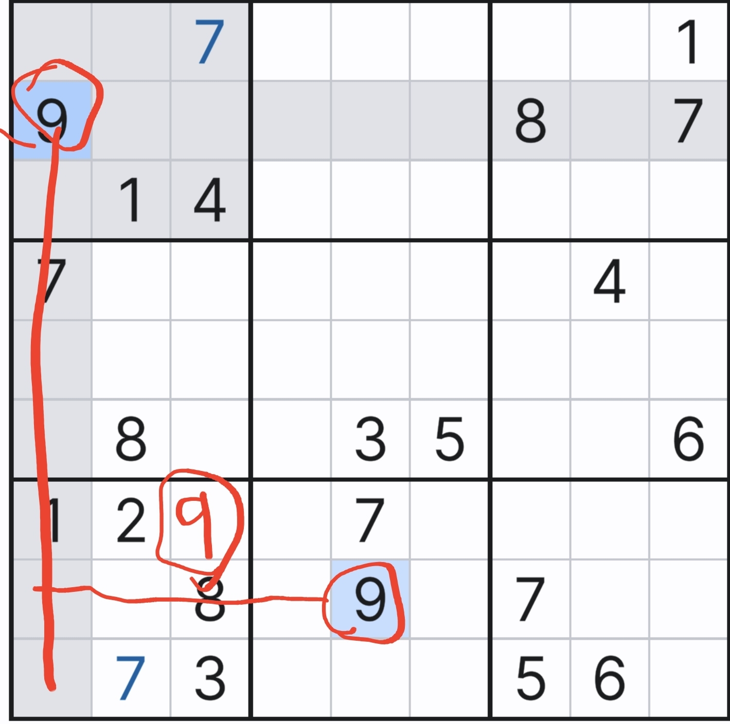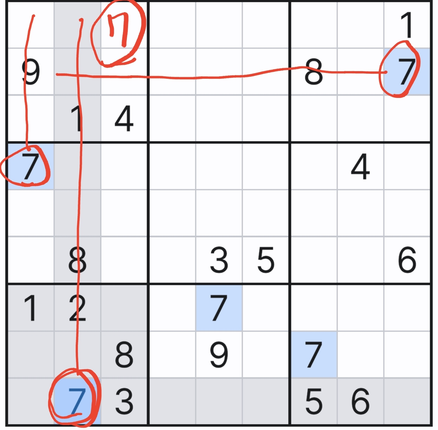 위와 같이 셀9, H1, H2 에 후보숫자 5가 들어가면 셀 8의 H열에는 5가 들어갈 수 없기 때문에 G4에 5가 들어가게 된다.