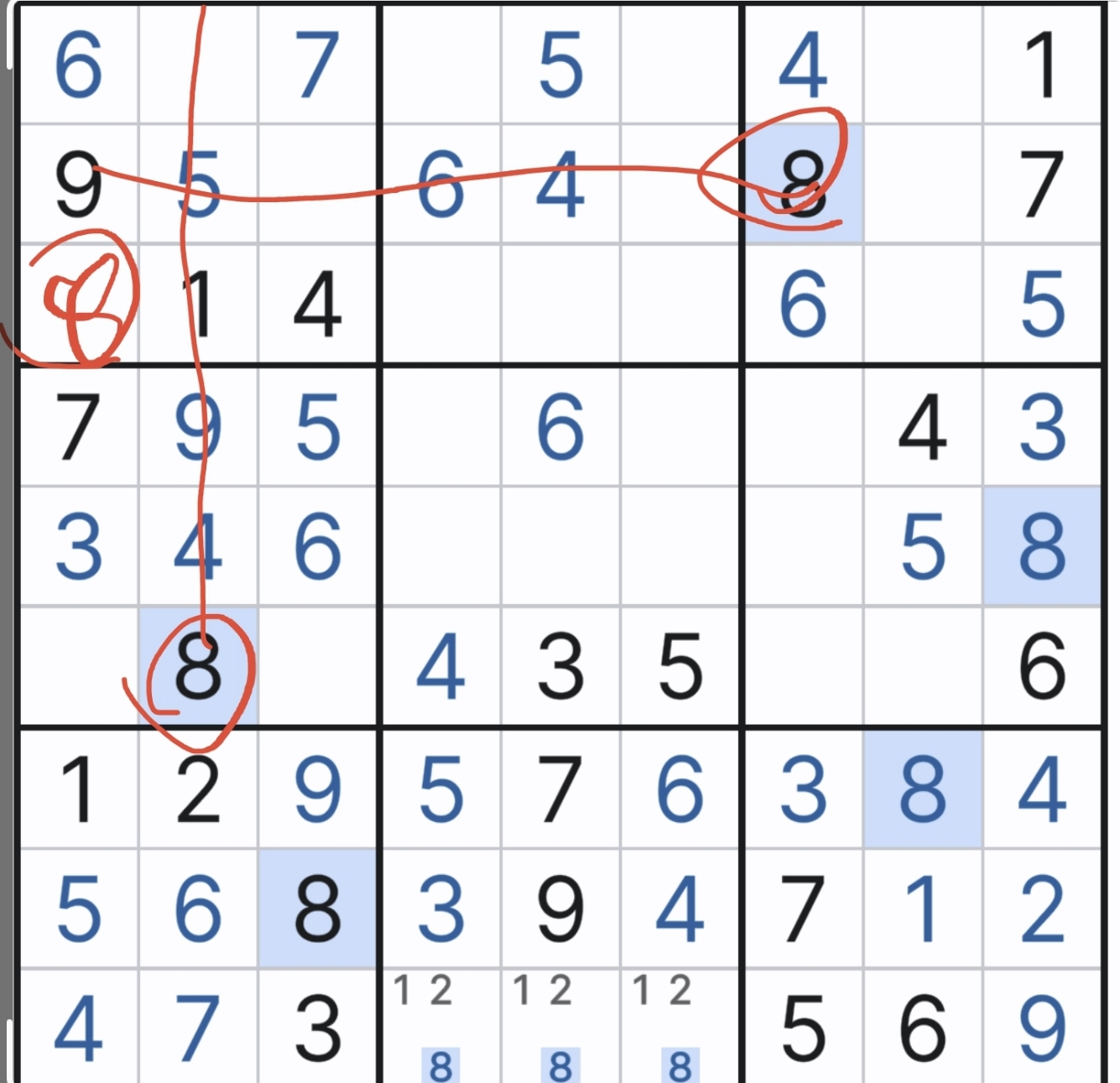 위의 그림처럼 A에 들어갈 숫자는 6과 8 둘중에 하나인데 현재 찾는 방법은 두 가지다 (후보 숫자가 다른 칸에도 있다면 풀이법이 더 있을 수도 있다.)