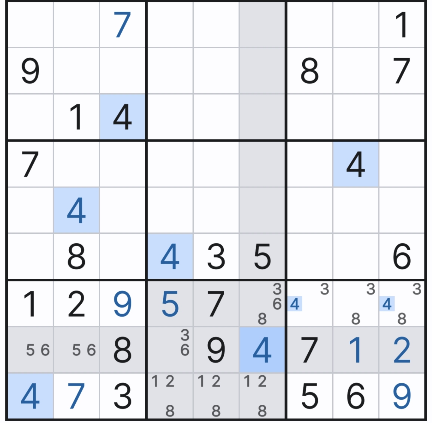 위와같이 셀 9에서 후보숫자 4는 G행에만 올 수 있으므로 같은 행에 있는 셀8의 G6에 있는 후보 숫자 4를 지울 수 있고 H열에 후보숫자 4가 유일하게 존대하므로 G6에 4가 들어 가는 것을 알 수 있가.