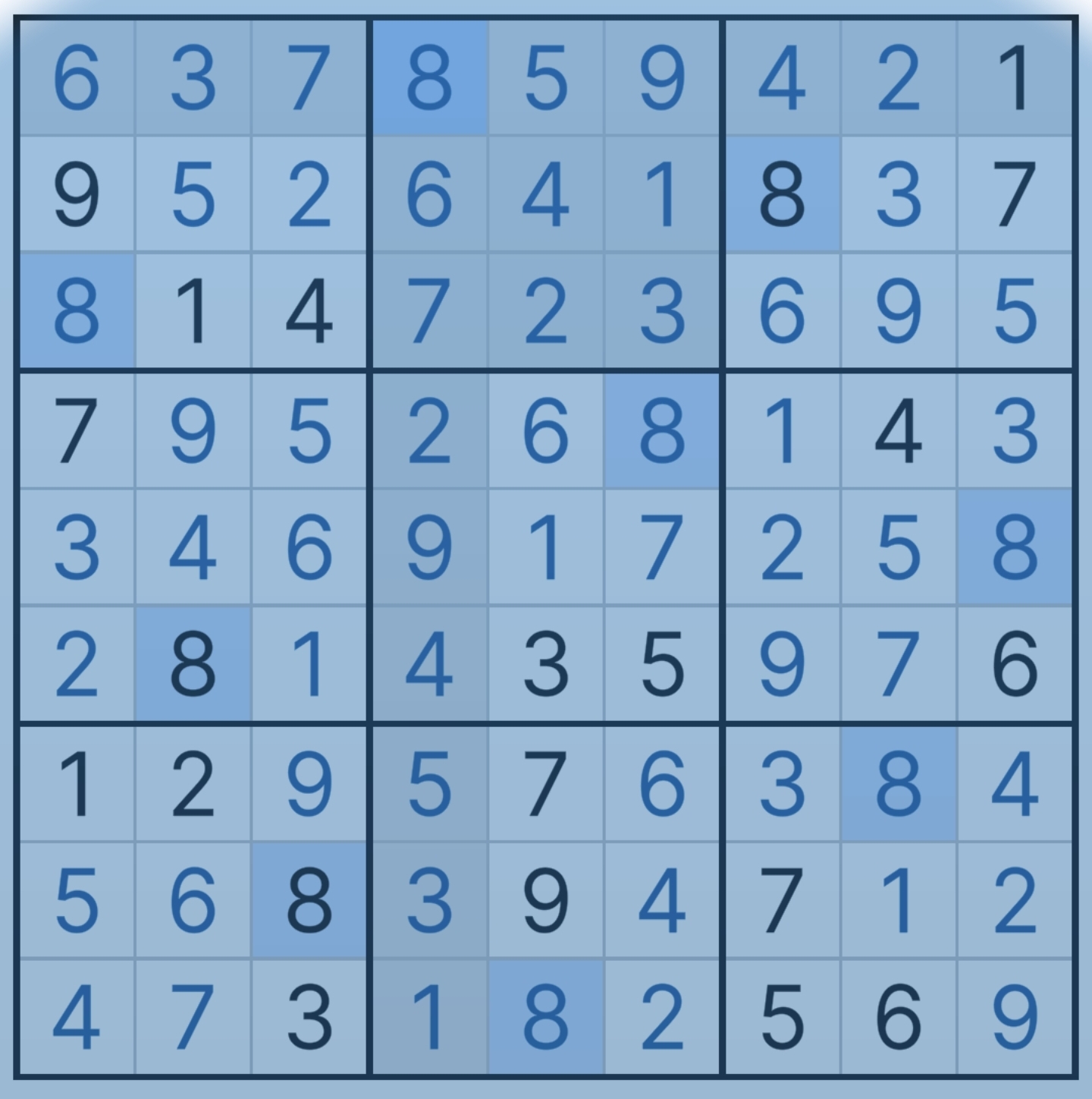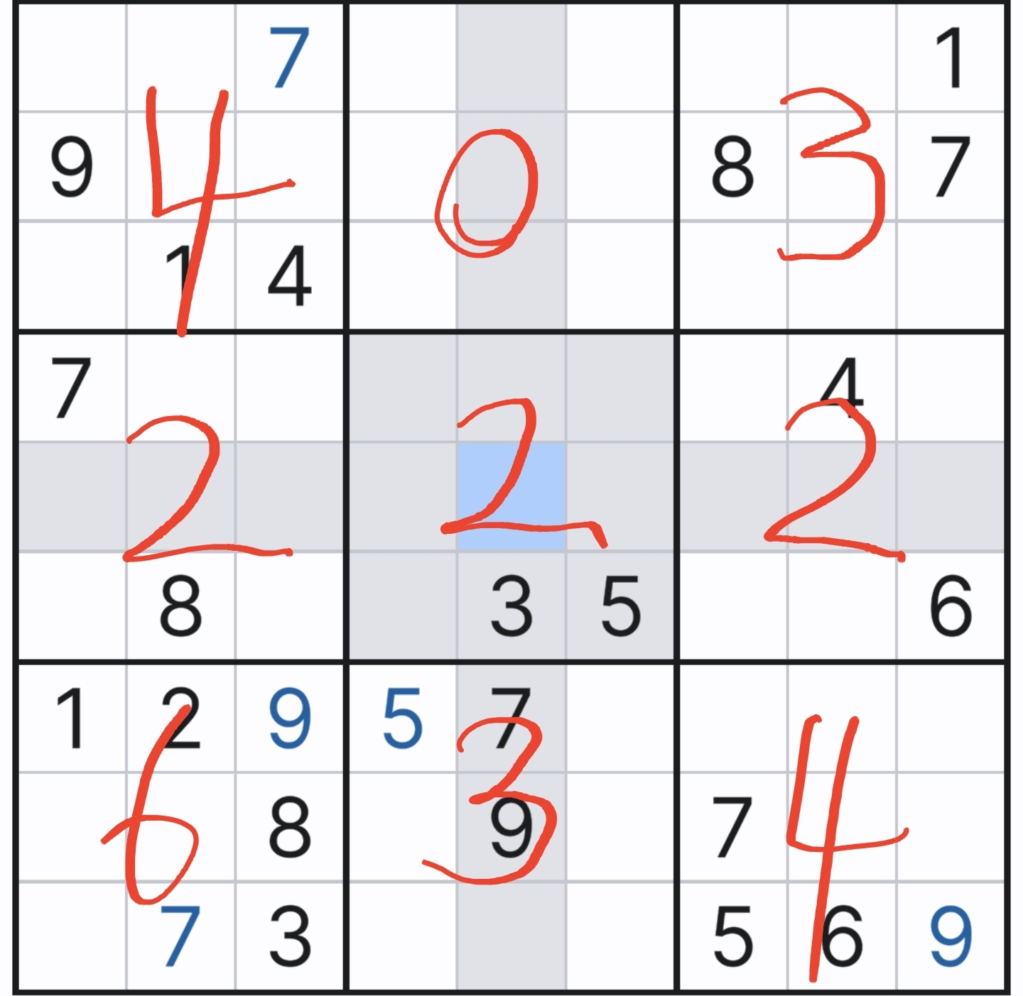 스도쿠 시작한지 17일차 공부기. 이번글에서는 스도쿠를 실제로 풀며 기본공식을 사용하는 것을 설명해 보겠다. 난이도는 초반에 드러난 숫자 21~23개 짜리다. 이렇게 표현하는 이유는 아직 스도쿠 난이도가 가늠이 되지 않아서이다. 실제 예제를 가져올 게임에 앱에 나타나는 난이도는 납득이 안되지만 마스터이다. 이번 글은 공식을 장황하게 설명한다기 보다는 실제 문제를 풀어 가는 과정을 기록했다. 일단 익숙해 지자는 의미다.
