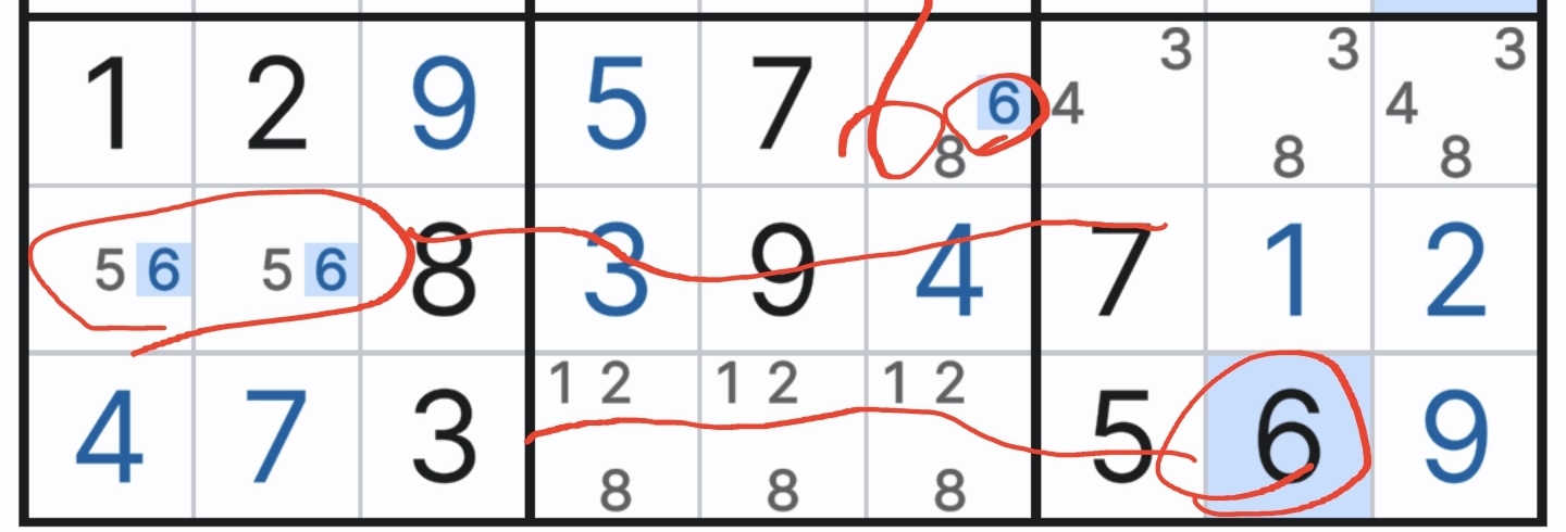 셀 7에 후보숫자 5, 6 확실한 페어'가 있고 셀9, I행에 6이 있으므로 셀8, H7에 6이 들어 가는 걸 알 수 있는데, 후보숫자가 다 있는 상항이므로 공식을 이용하면