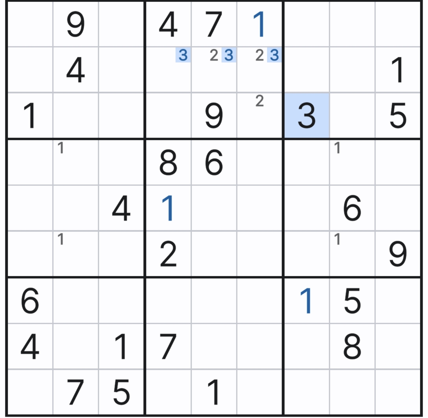 여러가지를 시도 해봤지만 초반에는 셀당 페어 후보 숫자 또는 연속된 트리플 후보 숫자를 찾아 노트하는 것이 제일 효율적이다. 산재한 트리플 이상의 후보 숫자 노트는 초반에 영양가 제로이다.