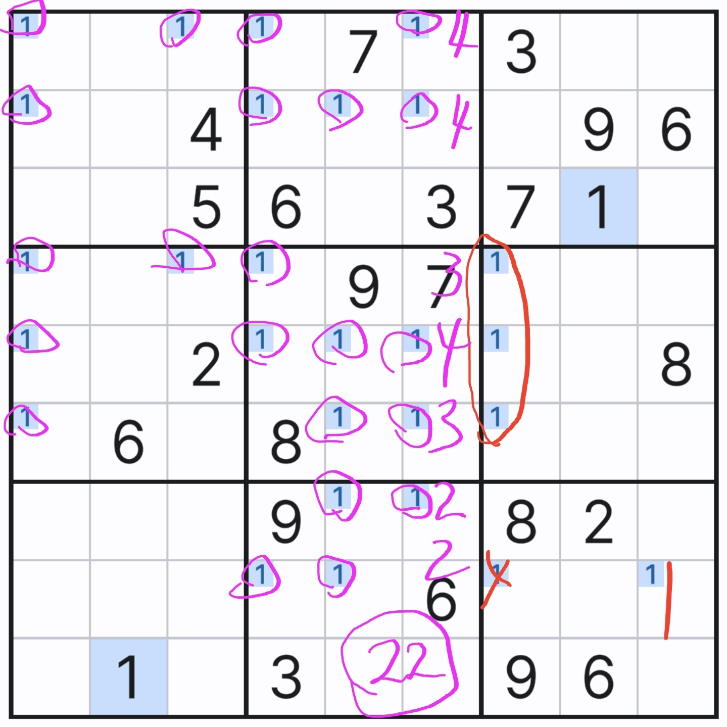 위의 그림이 이해 안되는 인원도 있을텐데 초반에 규칙없이 모든 후보숫자 1을 22칸 모두 넣으면 시간만 잡아먹고 다른 후보숫자를 지우거나 확정숫자로 바꿀수도 없다.
