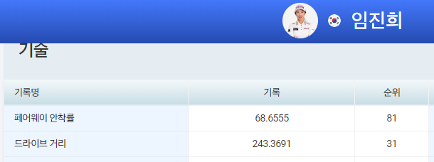 임진희 프로의 2024년 KLPGA 기록에서 드라이버 비거리는 246.12야드이고 페어웨이 안착률은 74.68%이다~ 그러면~ LPGA에서 기록은 어떨까? 가보쟈~ https://www.lpga.com/athletes/jin-hee-im/100380/stats