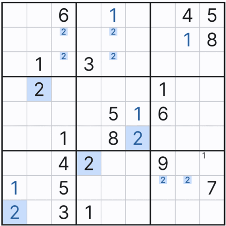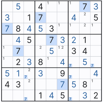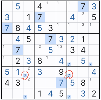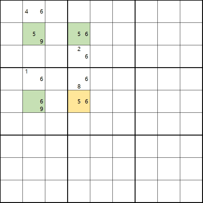 위의 움짤에서는 셀 4, 5, 7, 8 총 4개의 셀 안에 콤비를 이루는 후보 숫자가 들어가 있는데 2개의 셀에 2칸씩 존재하고 형태는 사각형이 아닌 사다리꼴 형태로 나타나게 된다.