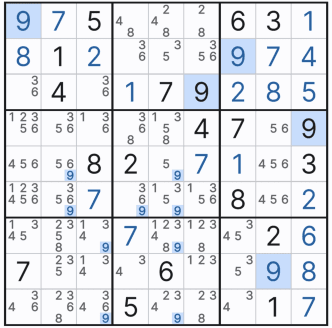 (1,7) > 2, (9,9) >2, 2개의 후보숫자를 제거할 수 있다.