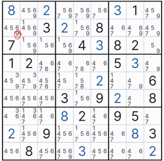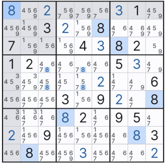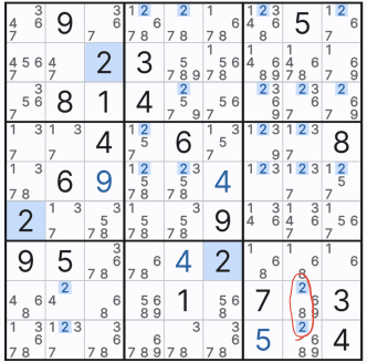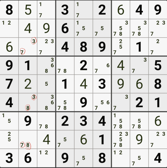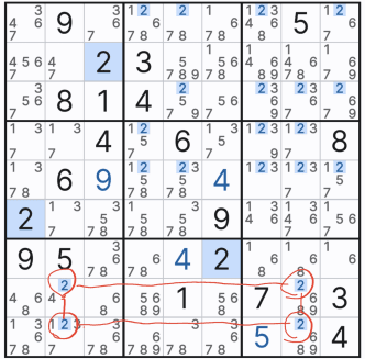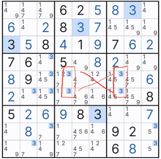 만약에 2-3에 후보숫자 X가 들어가면 빨간 선으로 이은 8-6에 X가 들어가서 확정될 것이고, 반대의 경우에는 8-3에 후보숫자 X가 들어가서 확정이 된다면 2-6의 후보숫자 X가 확정수가 될 것이다.