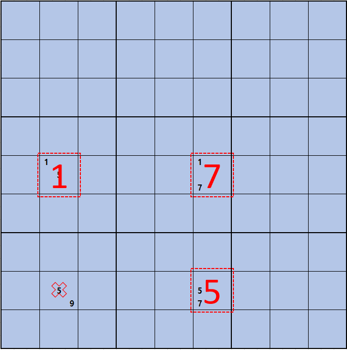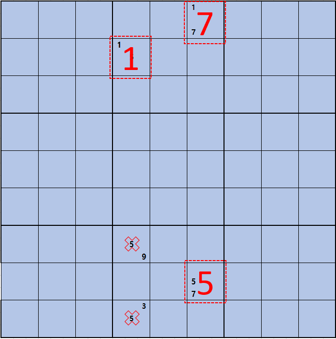 즉 어떤 경우라도 숫자 5가 (8,2)에 존재하는 5와 행 또는 열에 등장하기 때문에 15핀과 57핀이 중복되는 칸의 후보 숫자 5를 지울 수 있는 것이다.