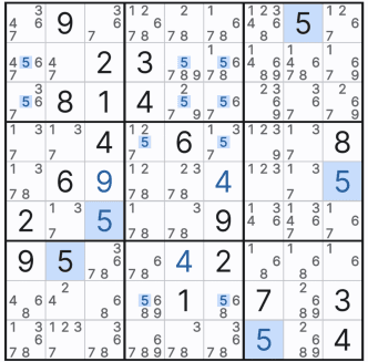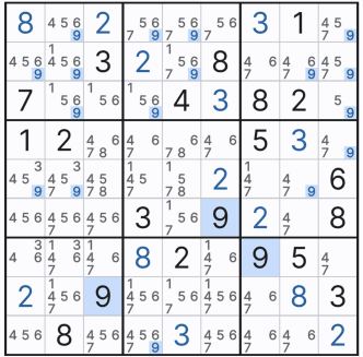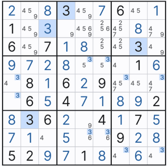 위의 실전2. 는 셀 9의 미확정 단일후보숫자 페어로도 풀 수 있다. '엑스윙'과 '미확정 단일후보숫자' 공식은 대략 50% 정도는 겹치는 것 같다. 눈에 보이는 대로 풀면 굿이다.