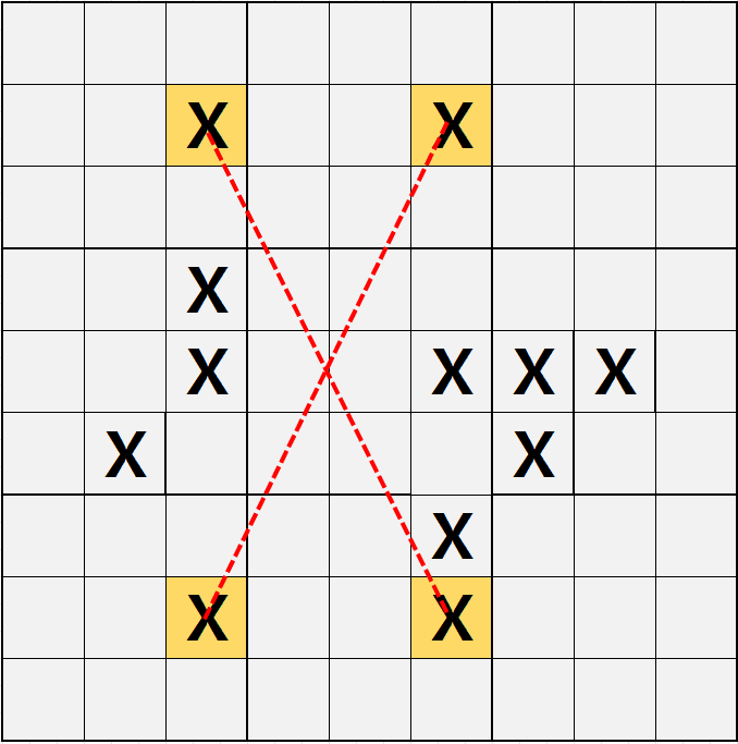 가상의 선을 그었을 때 사각형안에 정확히 대칭으로 들어오는 2개의 숫자는 2-3, 2-6 / 8-3, 8-6 칸의 X만 있다. 이때 숫자를 빨간색 점선처럼 이으면 X형태가 되는데, 후보숫자 X는 위의 4칸에 존재하게 될 것이다.