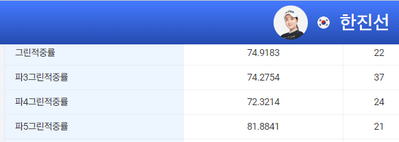 한진선 프로의 전체 그린적중률은 74.92%인데 파5에서는 그린적중률이 81.88%로 월등히 높은 것을 알 수 있다. 이는 파5에서 아이언을 잘 친다는 반증이기도 하지만 평균 비거리를 가진 한 프로가 우드샷을 멀리 보낸다는 반증이라고 추측해본다.