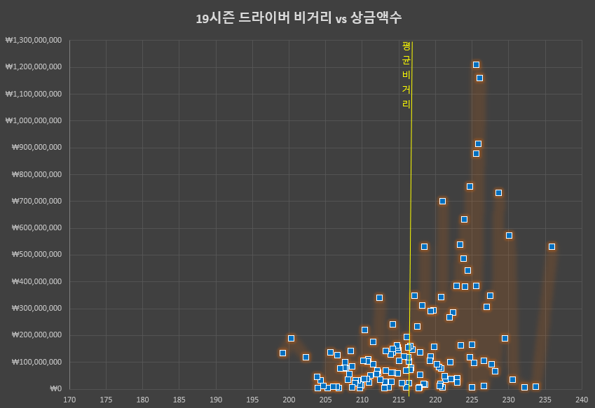 - 2019년 KLPGA 프로골퍼 드라이버 비거리 vs 상금액수 그래프