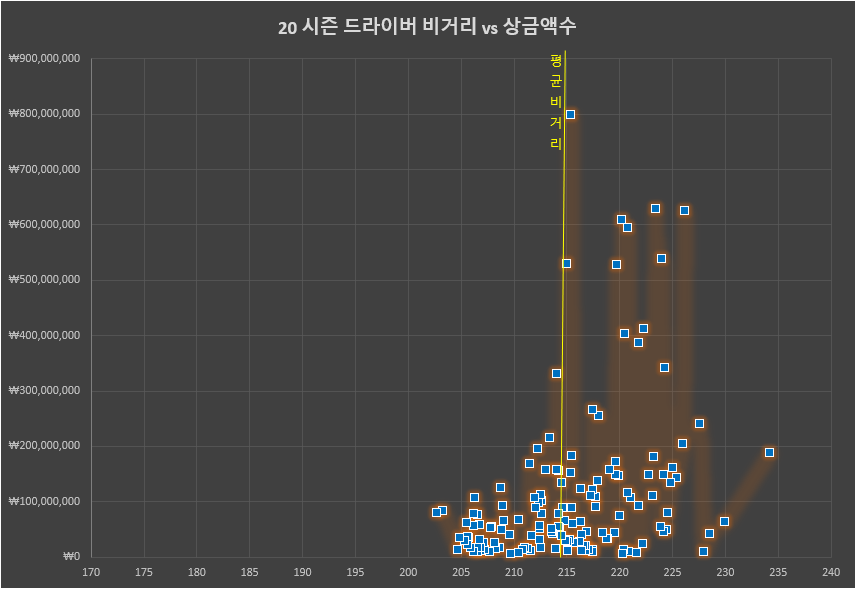 - 2020년 KLPGA 프로골퍼 드라이버 비거리 vs 상금액수 그래프