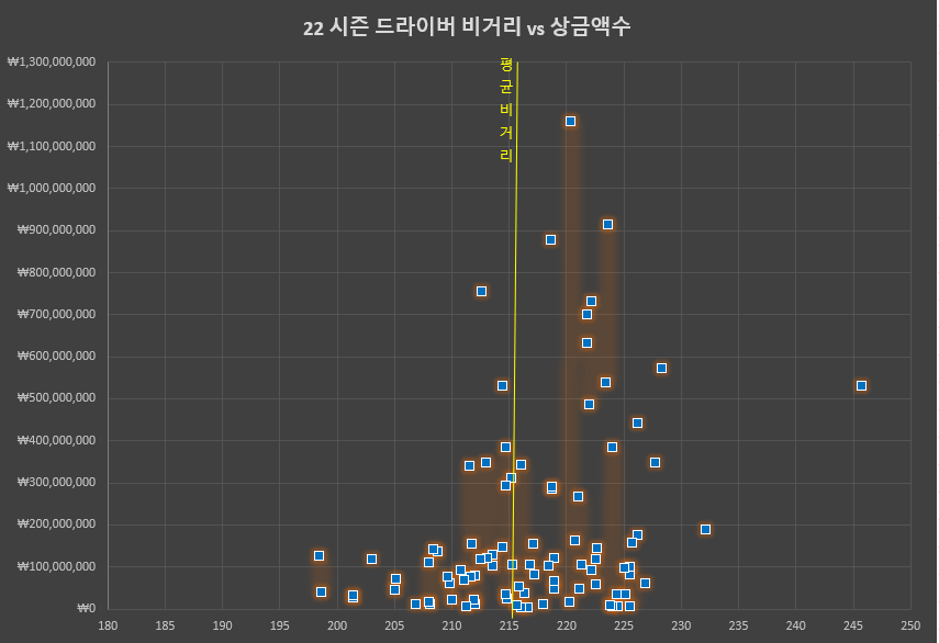 - 2022년 KLPGA 프로골퍼 드라이버 비거리 vs 상금액수 그래프