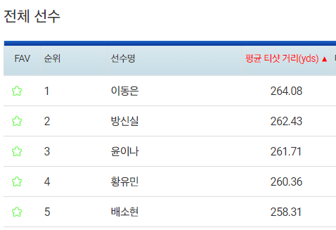 | 선수명 | 드라이브 비거리 | 페어웨이 안착률 |