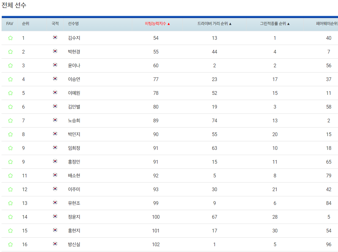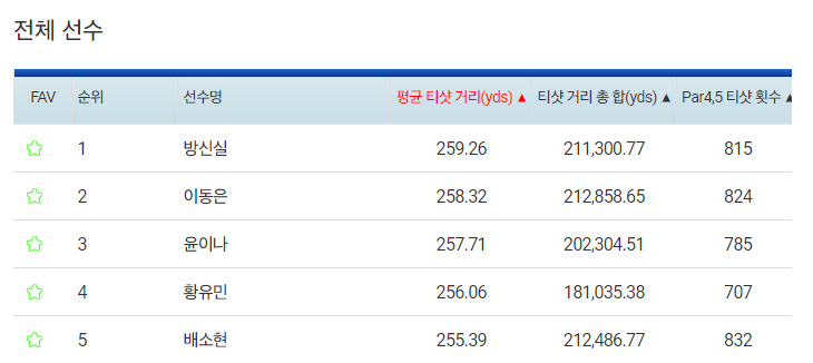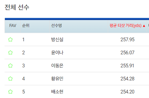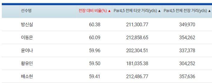 | 선수명 | 드라이브 비거리 | 페어웨이 안착률 |