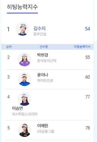 최근에 KLPGA에서 선수의 종합능력 지수를 나타낼 때 쓰는 종합 능력 지수와 히팅능력지수가 있는데 이 두가지 용어는 다른 골프 기술지수 순위를 합산한 종합 지표라고 보면 되겠다.