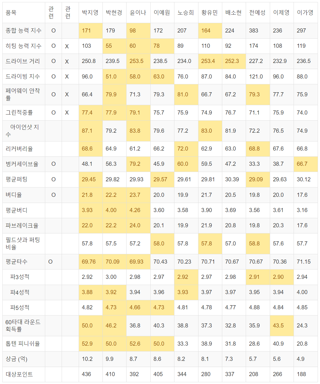 | 드라이브 거리 | O | X | 250.8 | 239.5 | 253.5 | 238.5 | 234.0 | 253.4 | 252.3 | 227.2 | 232.9 | 236.5 |
