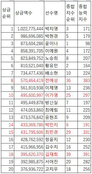 빨간색 칠한 선수들의 상금순위와 종합 능력 지수의 괴리율이 좀 큰 것을 볼 수 있다. (10위 이상 차이 나는 선수가 4명이다)