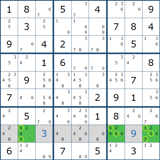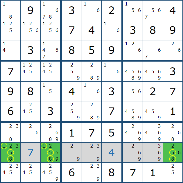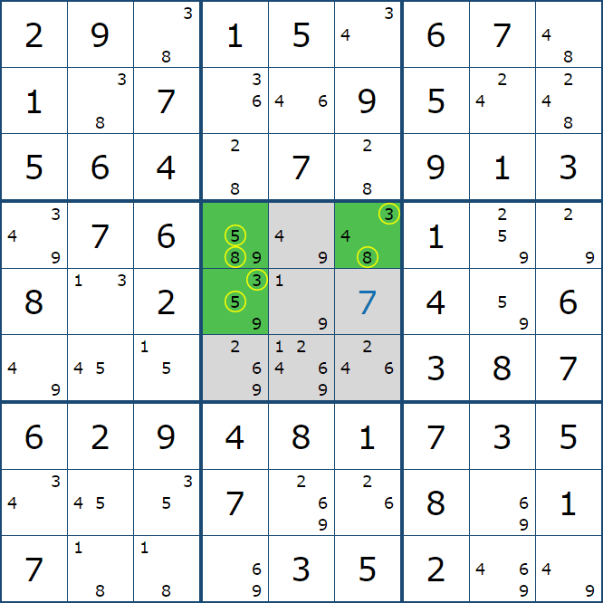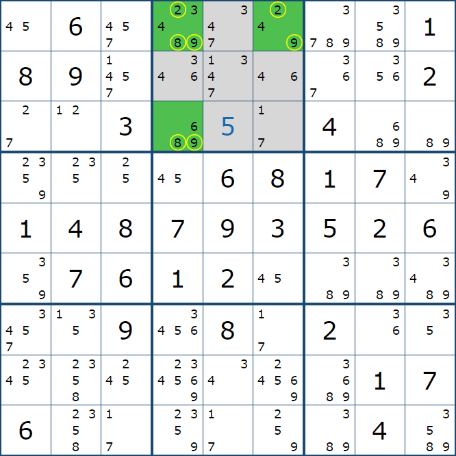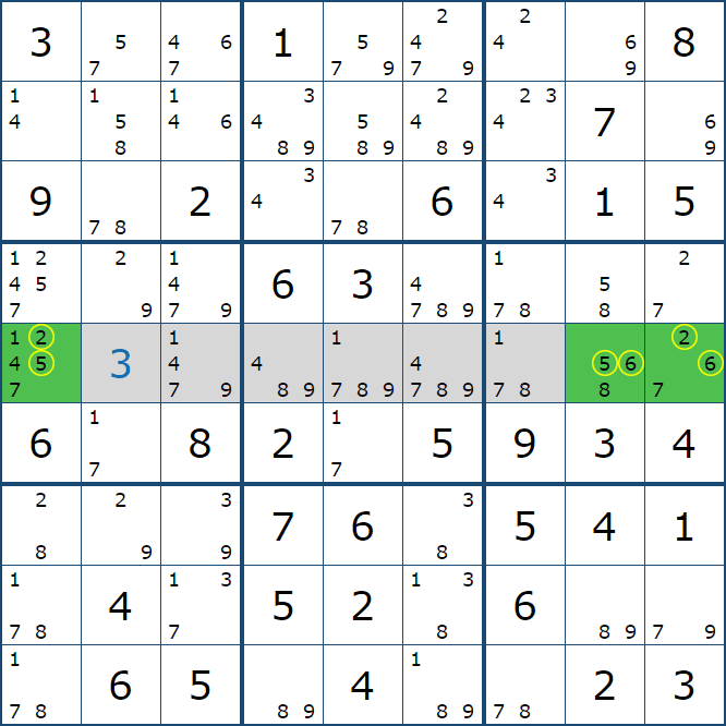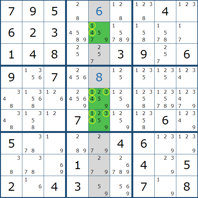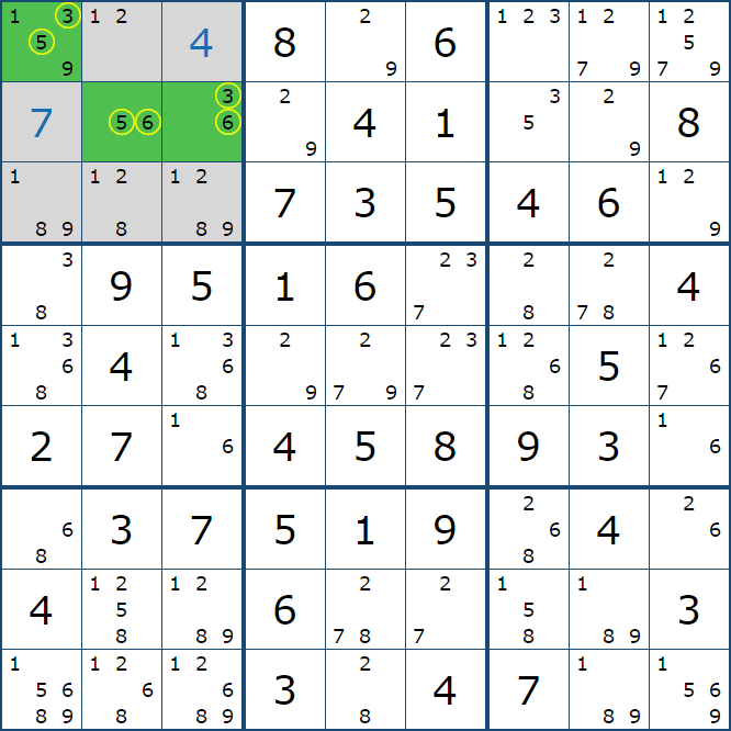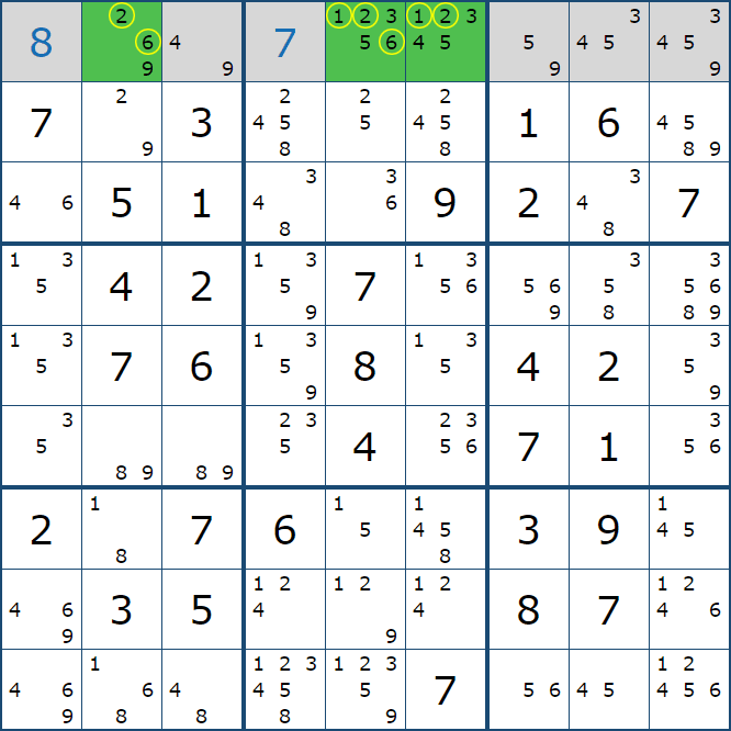 사례도 적은데 히든 페어와 묶지 않고 따로 포스팅을 하는 이유는 고급 문제에서 막혔을 때, 이 히든 트리플이 키 역할을 하는 경우가 자주 있기 때문이다.