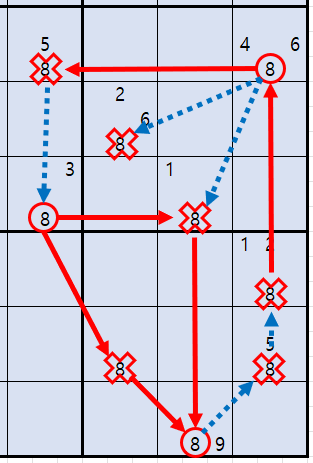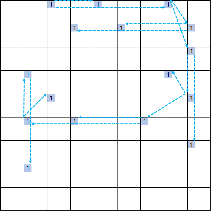 다이아그램2. 위크 링크 아래의 파란색 점선 화살표를 연결한 후보수 1을 보면 셀안에 3개, 행에 3개, 열에 3개씩 연결 되는 것을 알 수 있다. 즉, 한 개의 하우스 안에 후보수 X가 3개 이상의 칸에 존재하는 경우를 위크 링크라고 한다. 후보숫자 X끼리 선을 그으면 행, 열, 셀안에 2개 이상의 선을 그을 수 있다고 이해해도 되겠다.