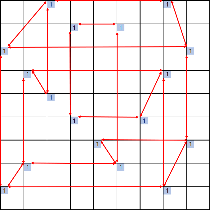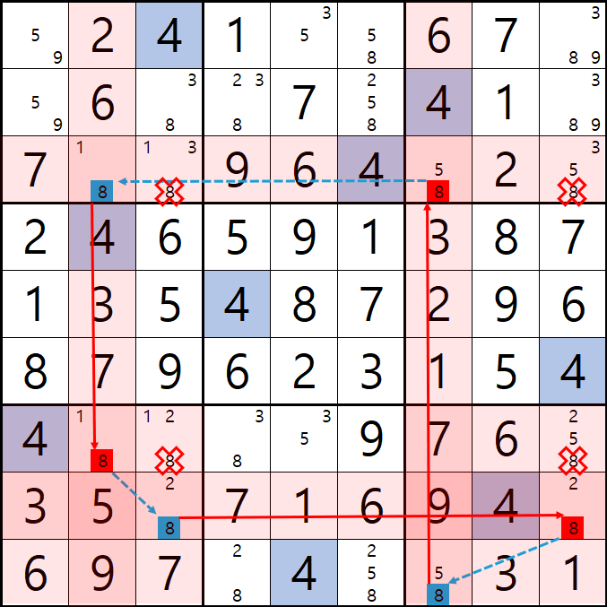 다이아그램1. 스트롱 링크 아래의 빨간색 화살표를 연결한 후보수 1을 보면 셀안에 2개, 행에 2개, 열에 2개씩만 연결 되는 것을 알 수 있다. 즉, 한 개의 하우스 안에 후보수 X가 2개의 칸에 존재하는 경우를 스트롱 링크라고 한다. 후보숫자 X끼리 선을 그으면 행, 열, 박스안에 1개밖에 그을 수 없다고 이해해도 되겠다.