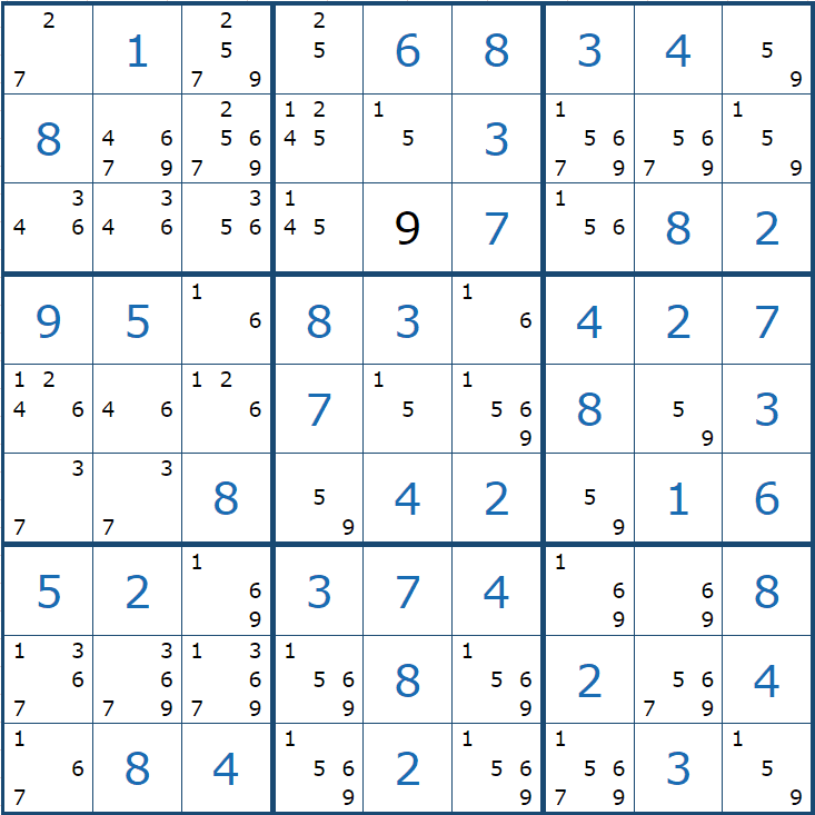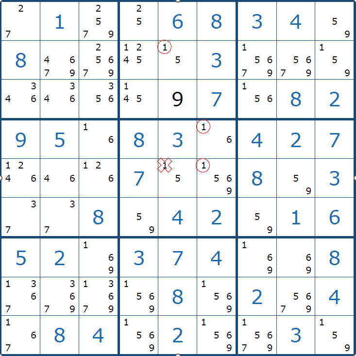 박스안의 위크링크가 나의 경우에는 찾기 어려웠다. 그래서 아래에 중반에 나타나는 '박스'안의 스트롱 링크와 위크 링크를 1~9까지 표기했다. (주의 할점은 아래는 박스에 나타나는 스트롱 링크와 위크 링크다. 경우에 따라서는 박스에 여러개의 후보 숫자가 있어서 위크 링크여도 행과 열에서의 링크를 판별할 때는 스트롱 링크가 될 수도 있다.)
