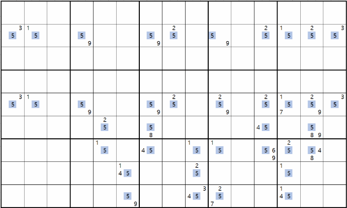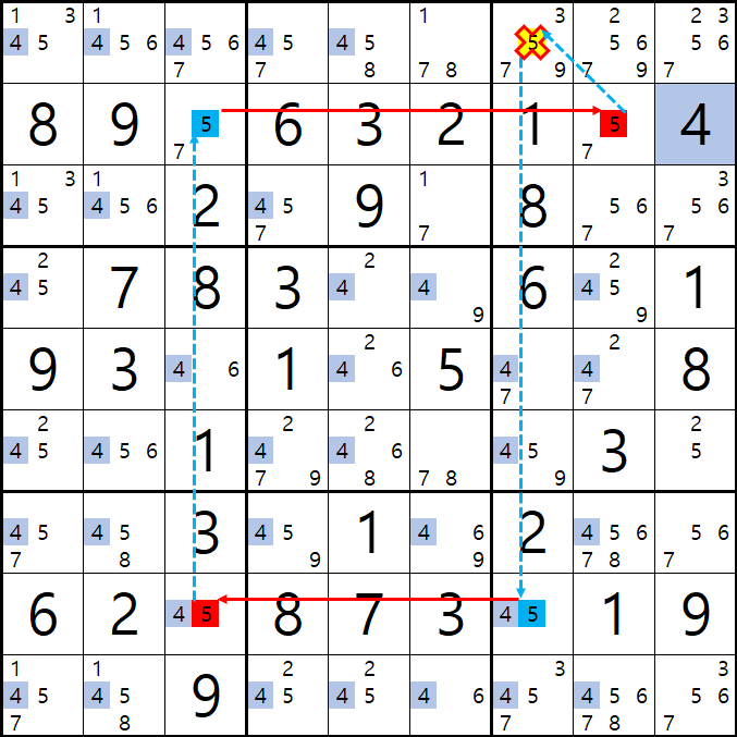 위의 움짤을 보면 하우스(5열) 안에는 (2,5), (5,5) 두칸 에만 1이 있으므로 후보수 1에 대한 스트롱 링크가 되며(확실한 페어를 같는 열로 후보 5 또한 스트롱 링크가 된다.)