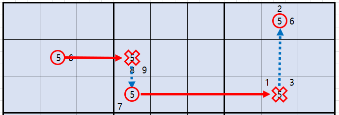 위의 움짤에서 보면 (5,2)와 (5,5)칸에 위치한 후보숫자 1이 5열에 마주보며 링크되어 있다.