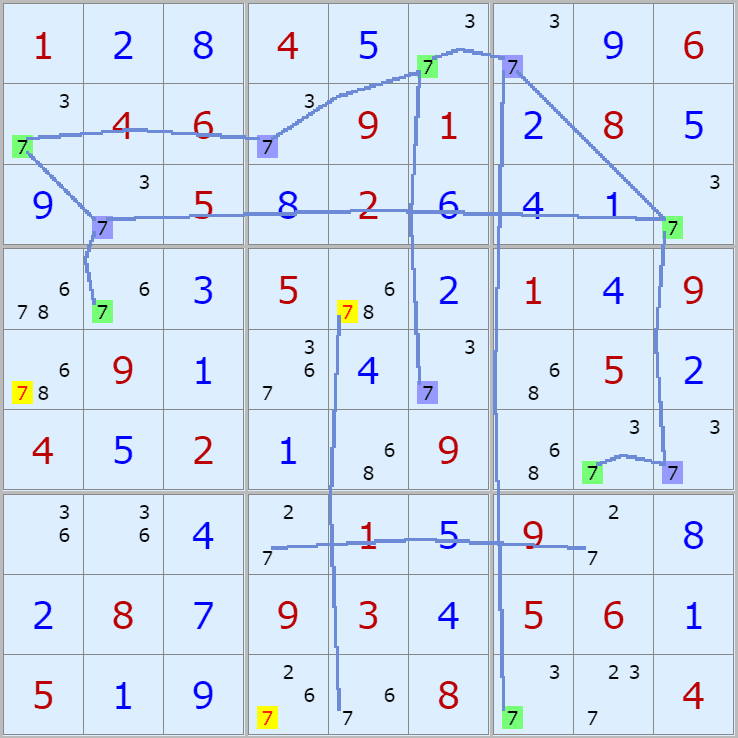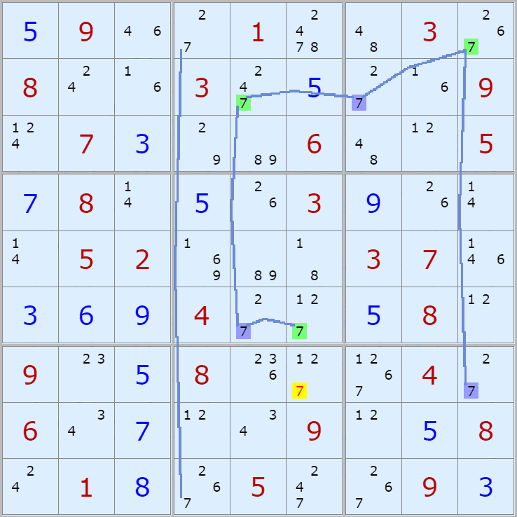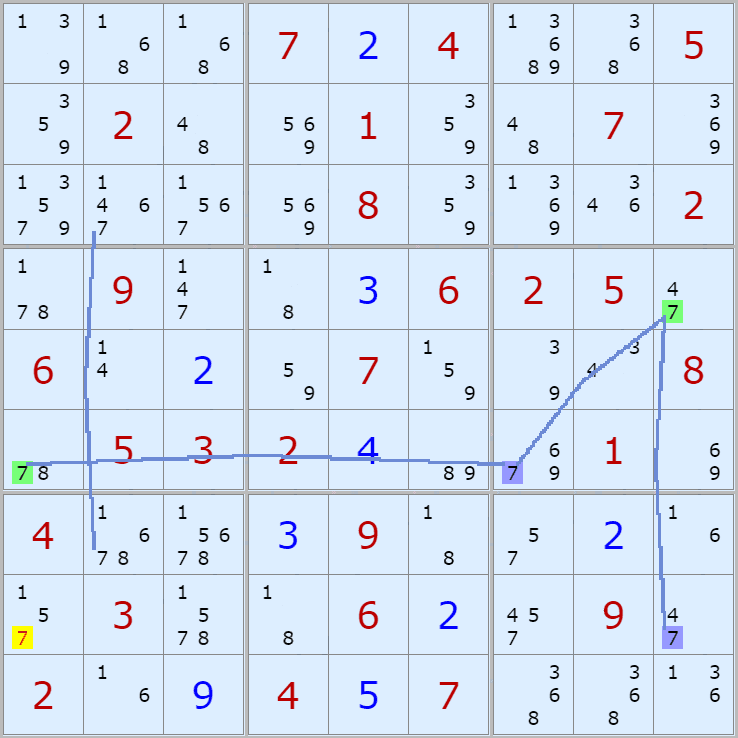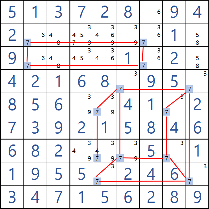또한 체인을 이루는 행과 열에는 동일한 후보숫자 7이 올수 없음을 직관적으로 알 수 있다. 위의 그림에서 하부의 링크들을 보면 젤리 피쉬의 형태임을 알 수 있다.