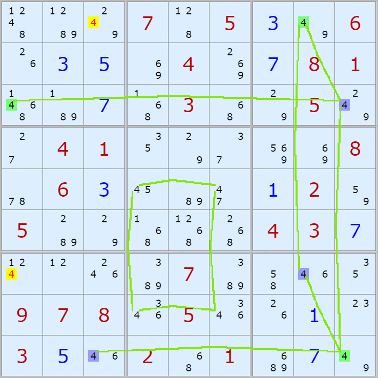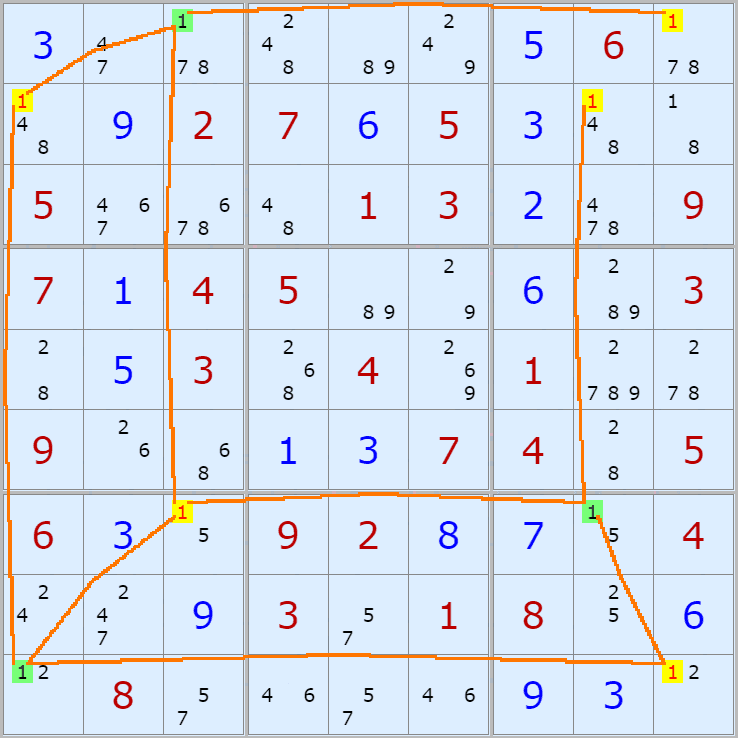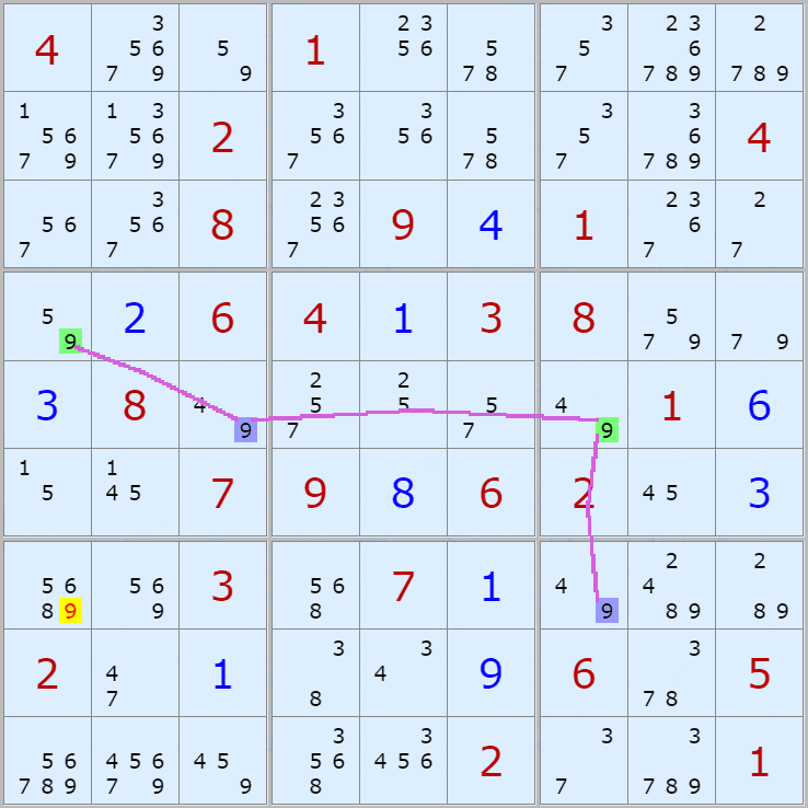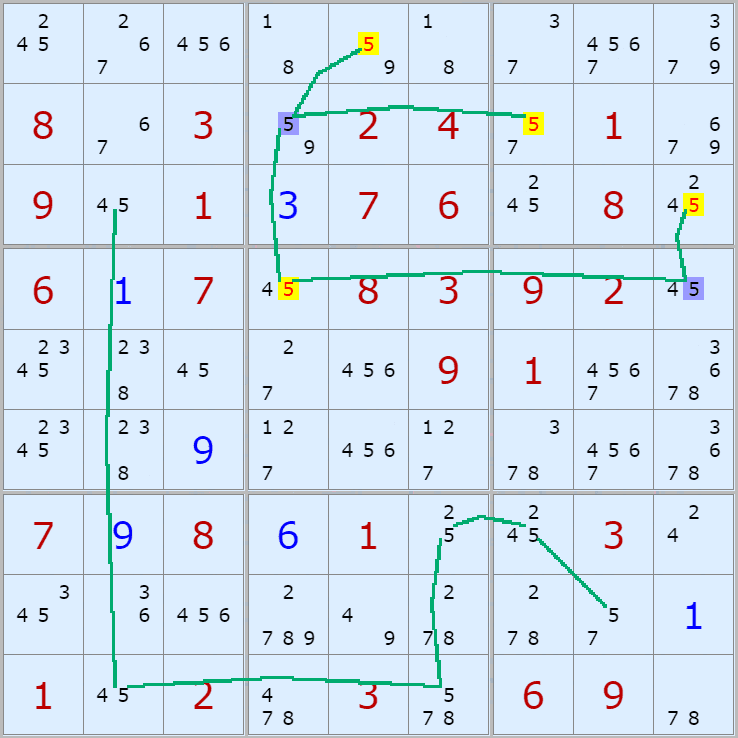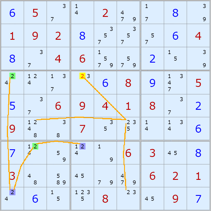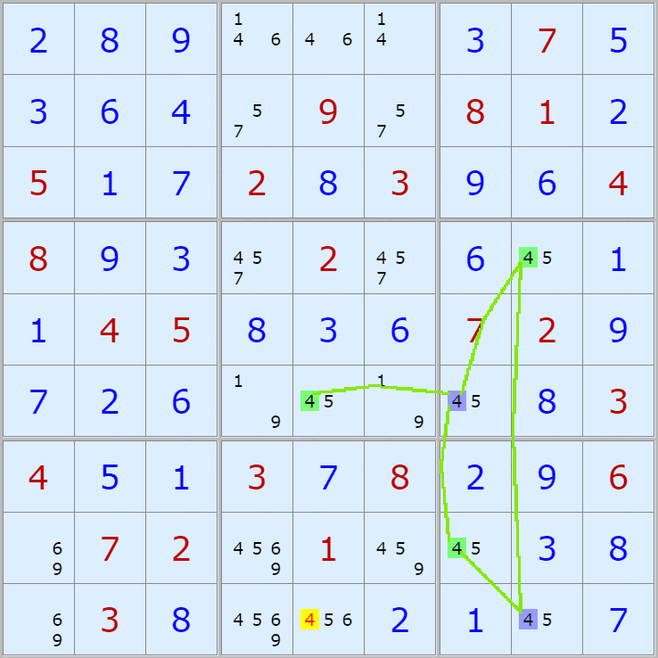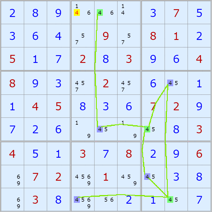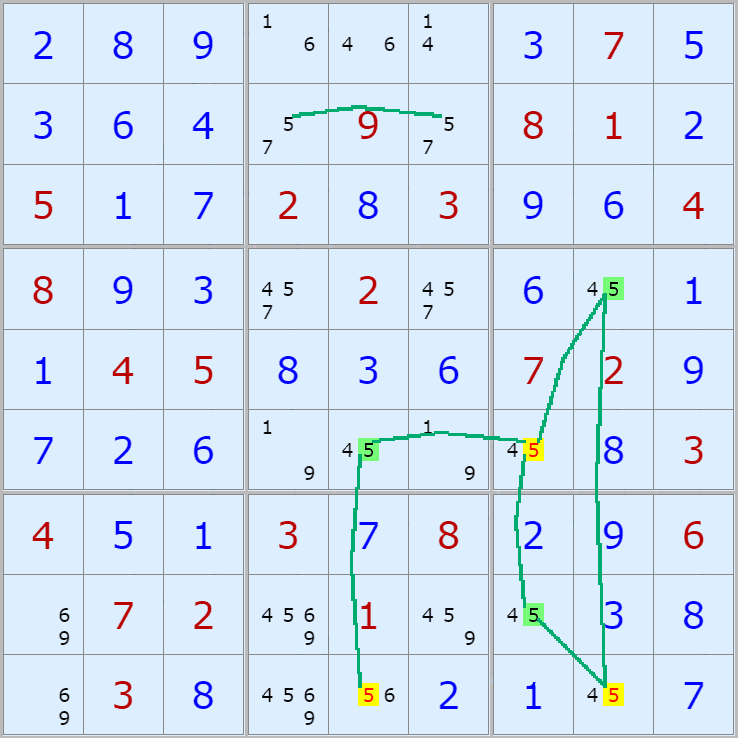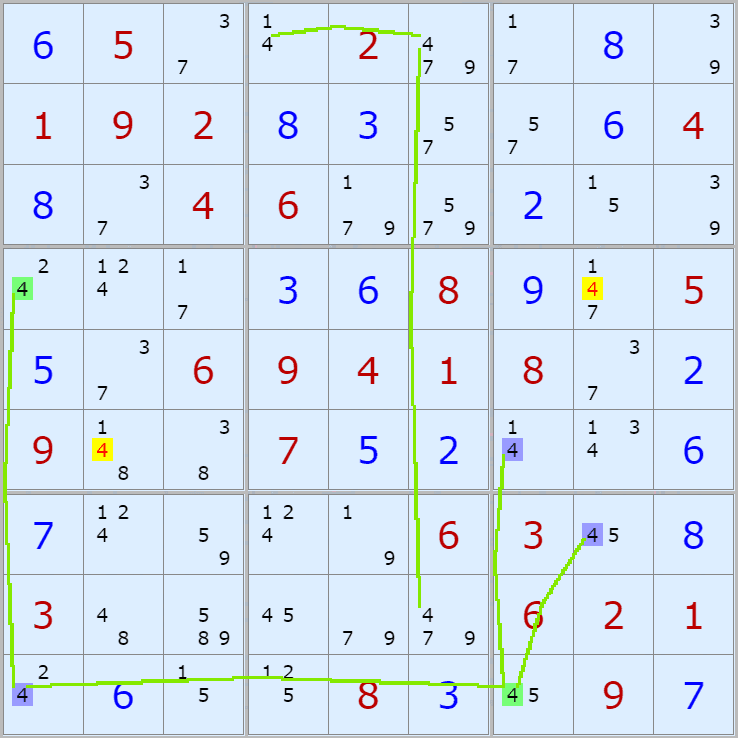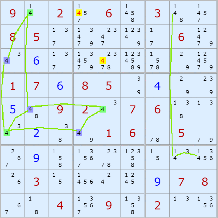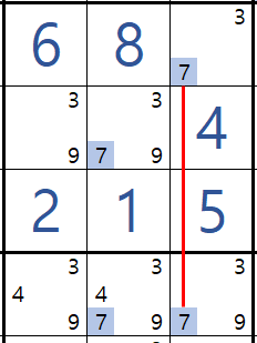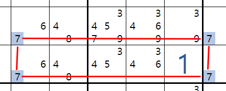 스도쿠를 좀 알아가다 보니까. 기술을 이해 하는 것도 중요하지만 공식이 쓰인 사례를 많이 봐야 한다고 생각한다. 의외로 싱글체인은 만나기가 어렵다. 그래서 잘 보이지 않는다.