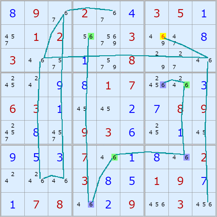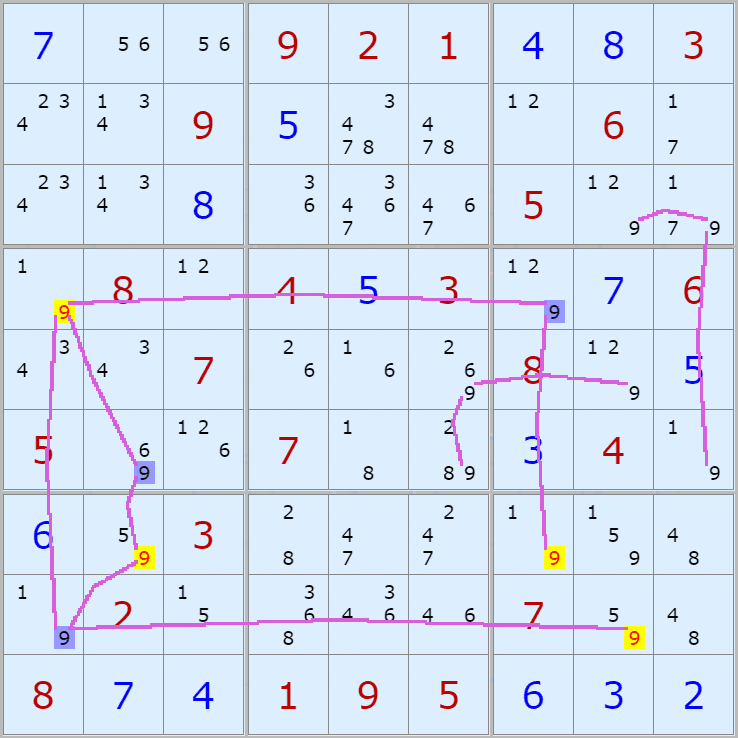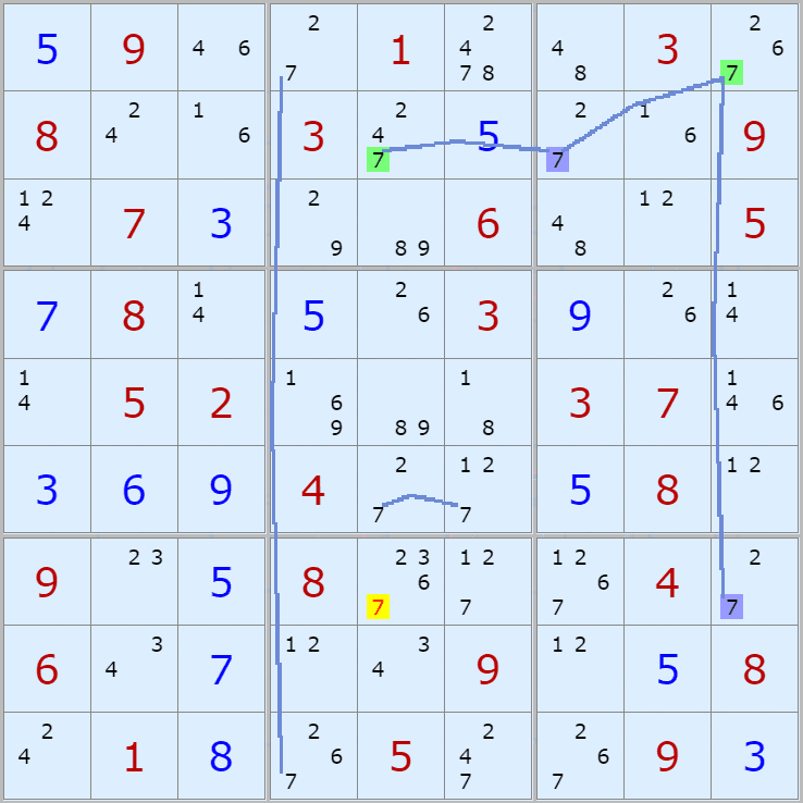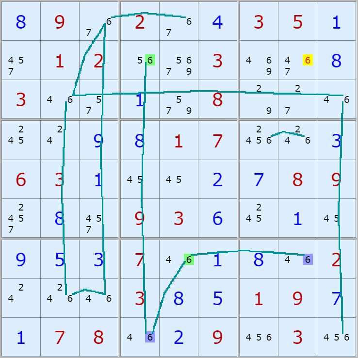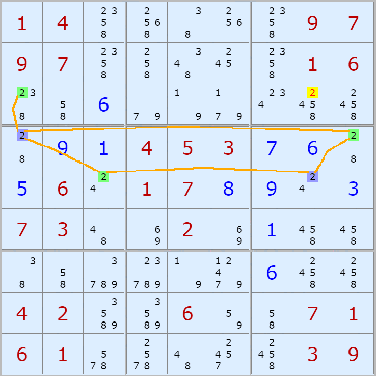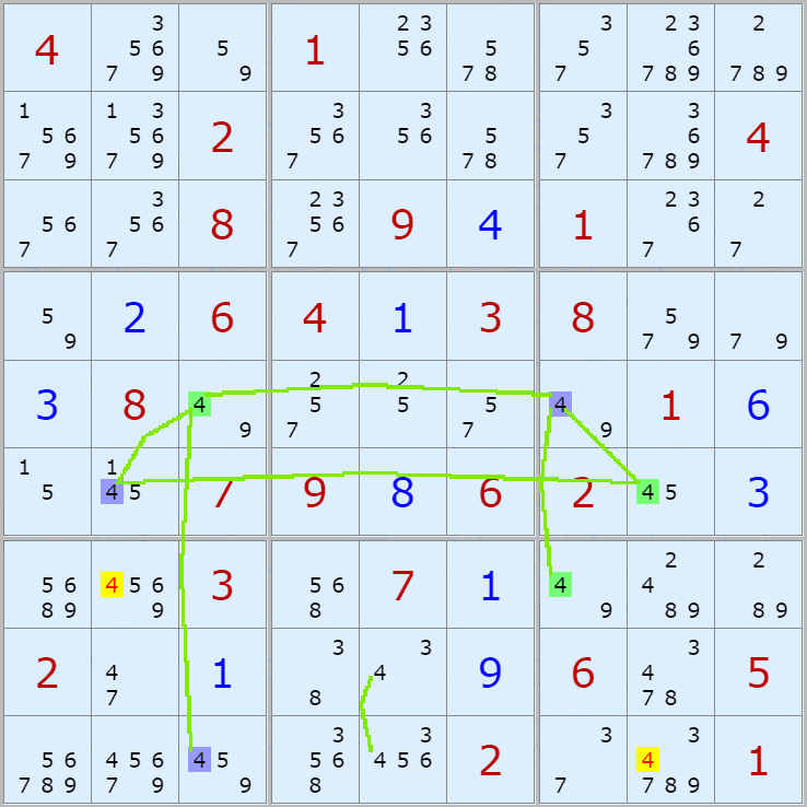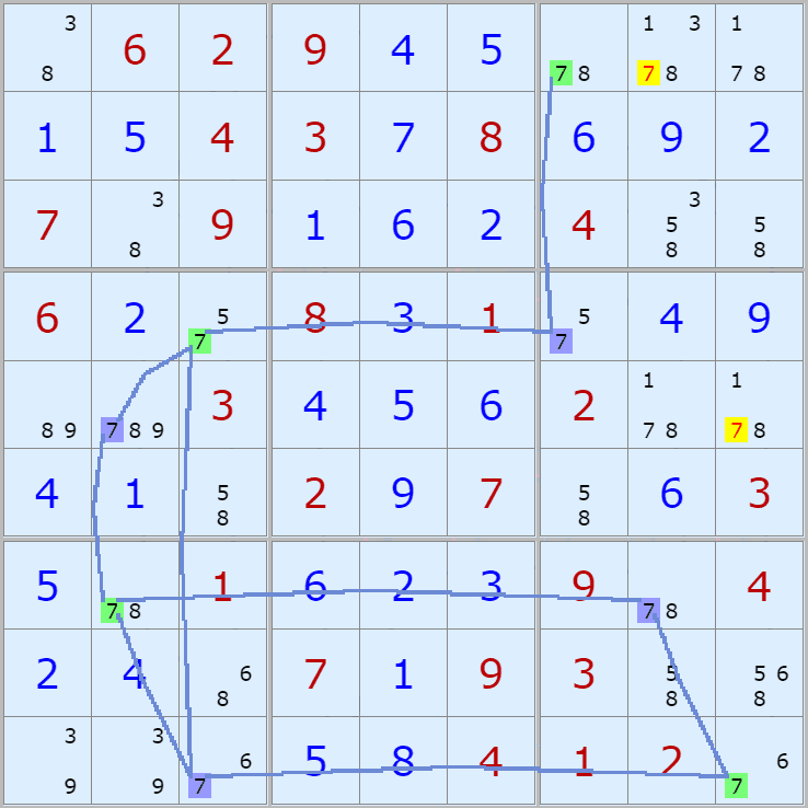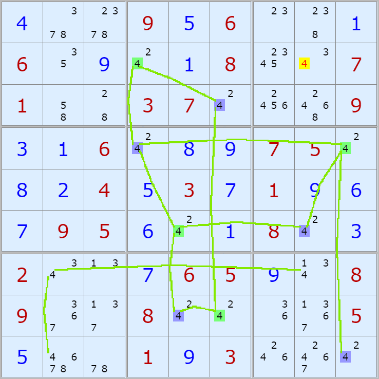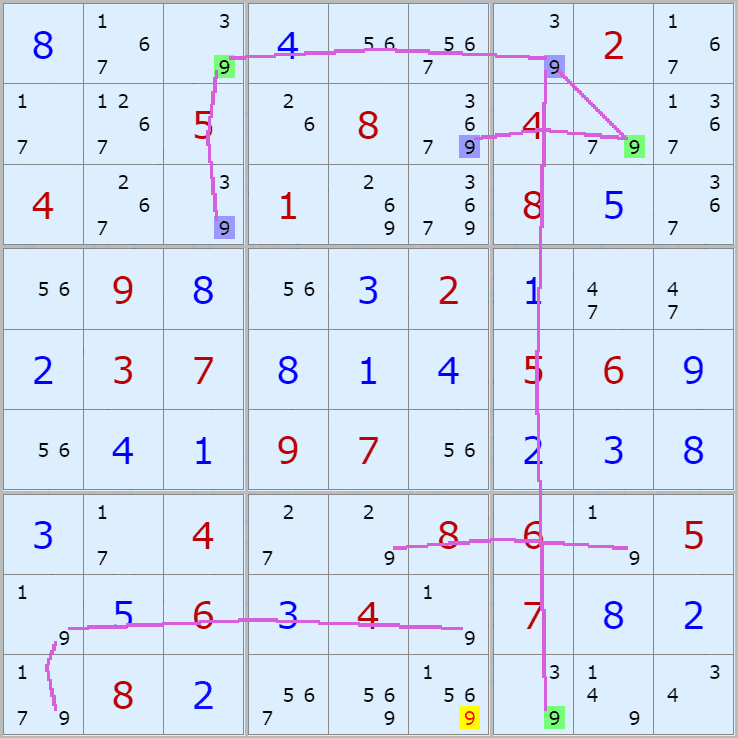 스도쿠를 좀 알아가다 보니까. 기술을 이해 하는 것도 중요하지만 공식이 쓰인 사례를 많이 봐야 한다고 생각한다. 의외로 싱글체인은 만나기가 어렵다. 그래서 잘 보이지 않는다.