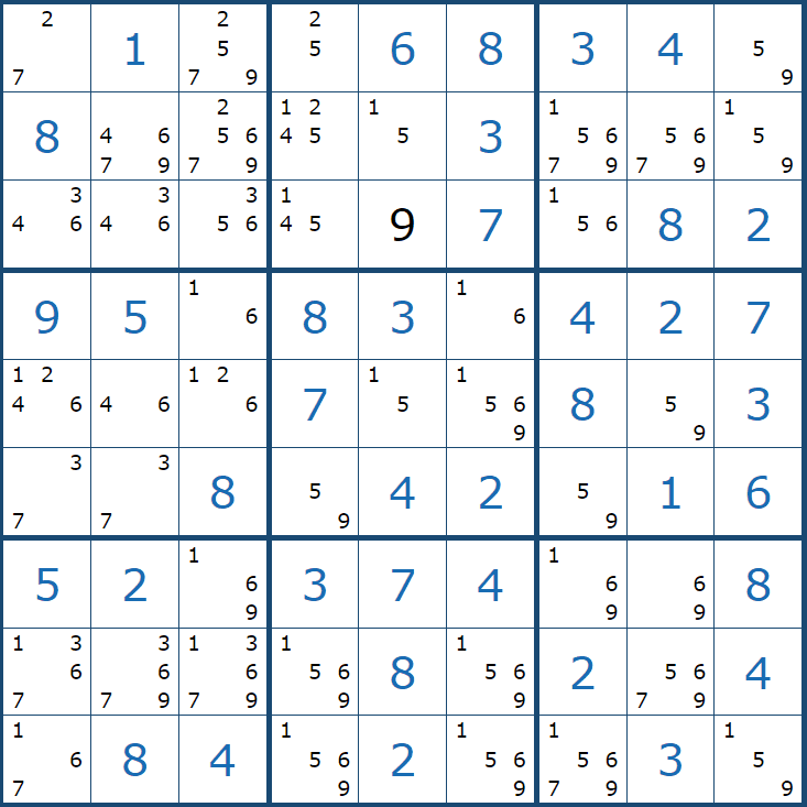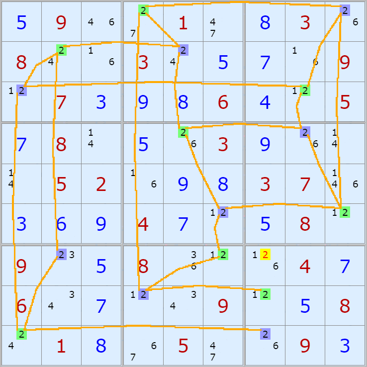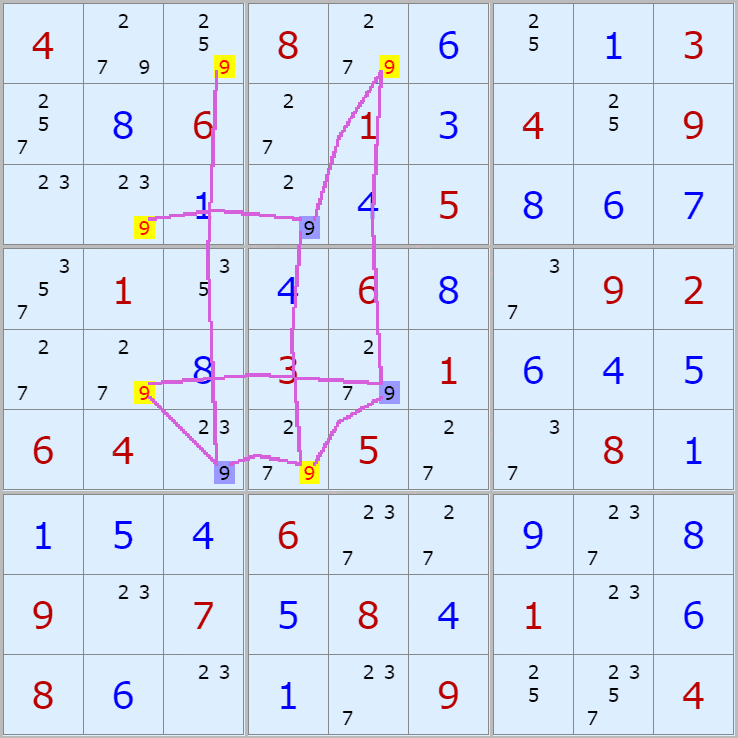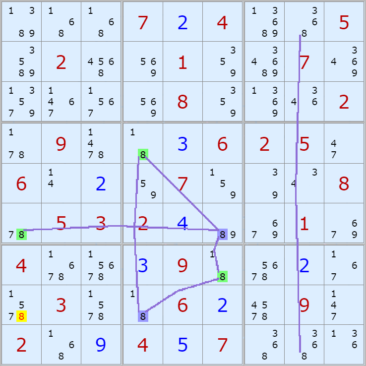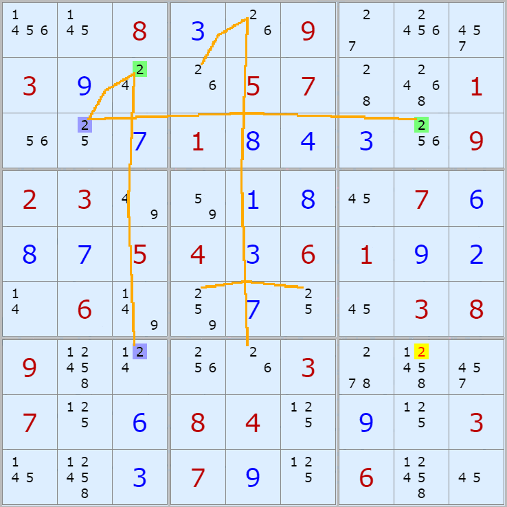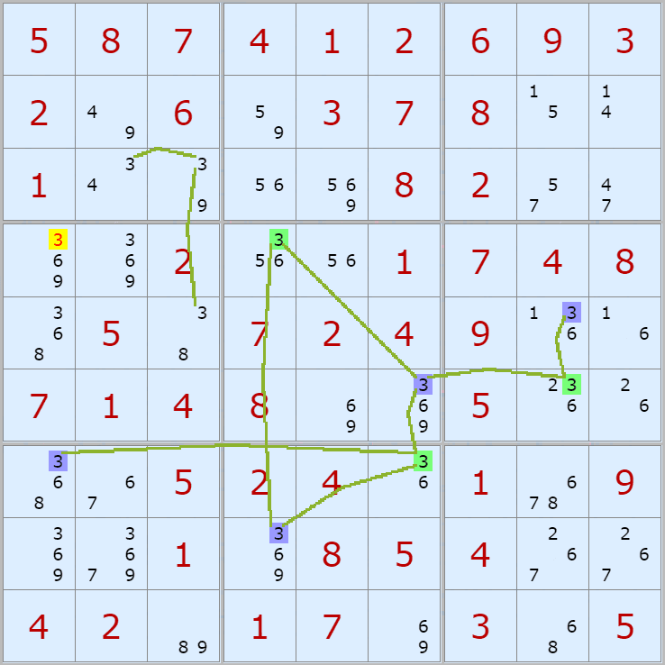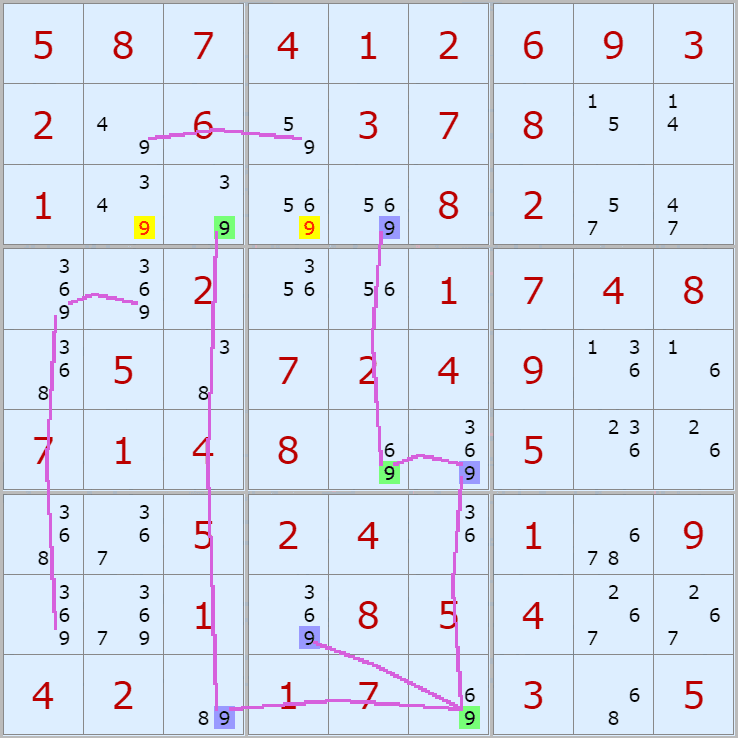 그래서 앞으로는 항상 '후보숫자 X가 아니라면'이라는 경우만 설명 또는 도식화 할 것(싱글 체인 뿐만 아니라 모든 체인의 시작이라고 봐도 무방하다.) 이고 위와 같이 숫자를 사용하기 보다는 직관적으로 볼 수 있는 아래와 같은 다이아그램 형식의 그림으로 표현할 것이다. (나의 방법은 아니고 스도쿠계의 관행인 거 같아 보이고, 나도 직관적이라 보기 좋다.) 또한 모든 것을 움짤로 만들기에는 시간도 많이 걸려서 아깝기도 하고 아래의 그림 처럼 한장으로 서로 교감할 수 있다는 것도 합리적이라고 본다.
