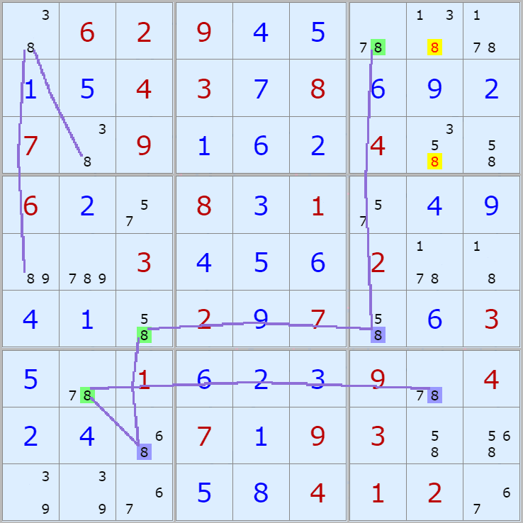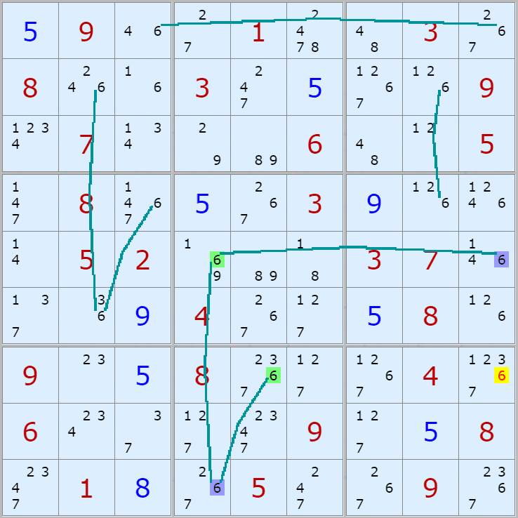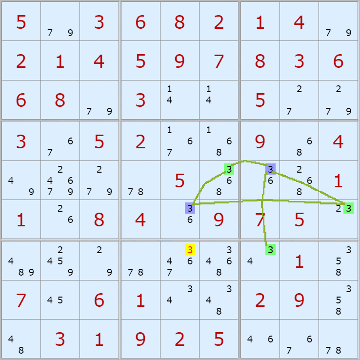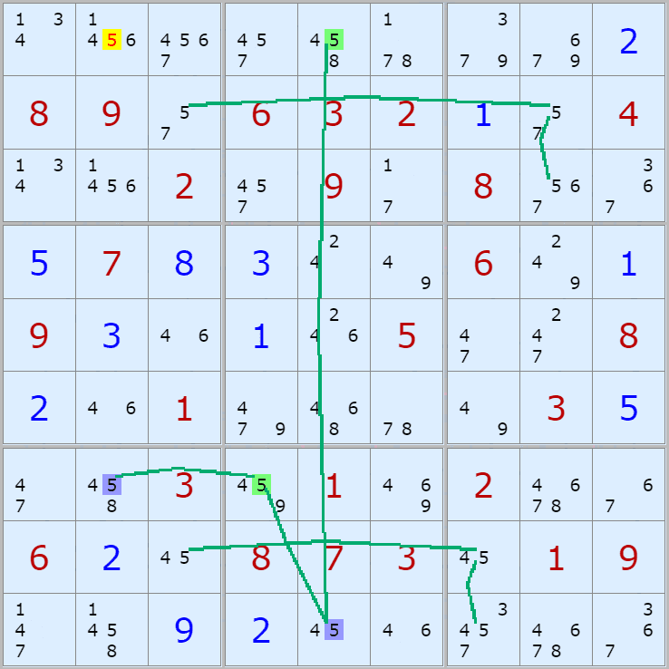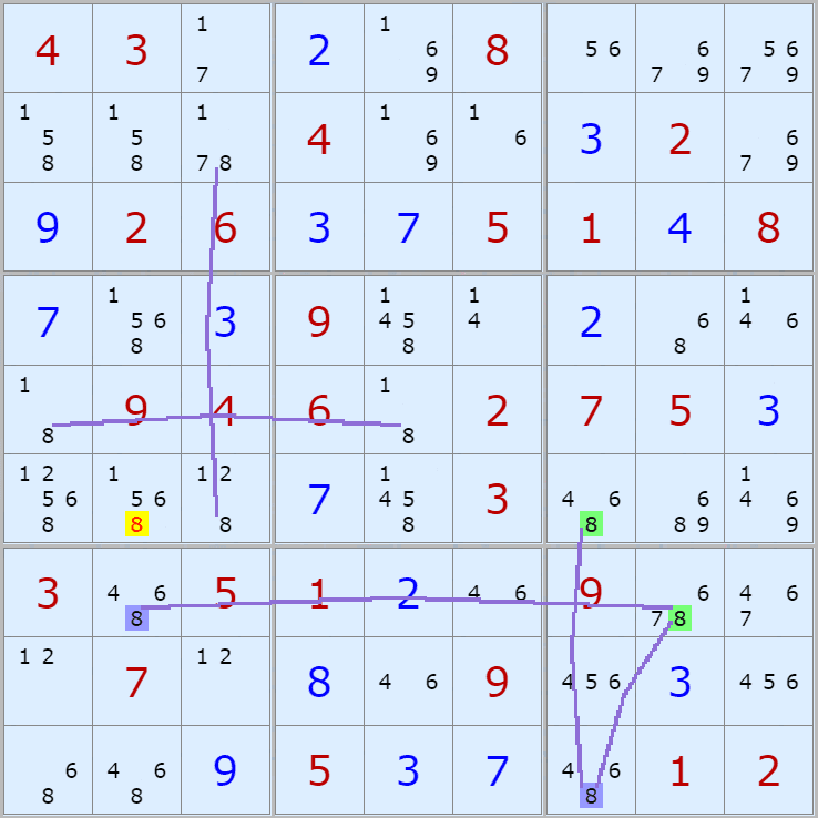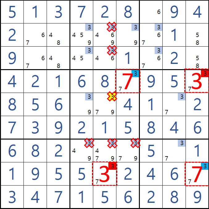 위의 움짤 처럼 (4,6)이 3이 아니라면 (8,5)칸이 3이 되고, 같은 셀에 있는 후보숫자 3 전체와 5열에 위치한 수보숫자 3 모두를 제거할 수 있는 것을 알 수 있다.
