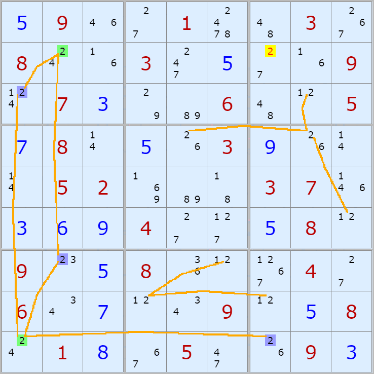 - 체인의 추적은 2개의 후보숫자가 들어 있는 칸에서 시작한다. (3개 이상의 칸은 시작점을 찾기가 힘들다.)