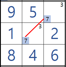 위크 링크 - (1,3) 칸이 7이라면 (4,3)칸은 3 또는 9가 되고, (1,3) 칸이 3이라면 7 또는 9가 되는 조건부 링크를 위크 링크라고 부른다. 또한 위크 링크의 형태가 또 하나 더 있는데.. 설명할 때는 점선으로 나타낸다.