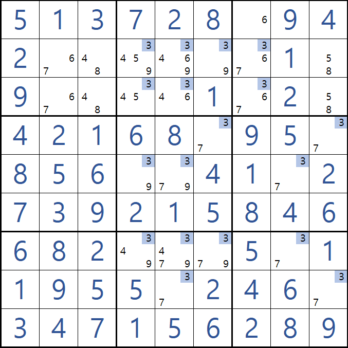 (1,8)칸에 있는 후보숫자 3을 1개 제거할 수 있다.
