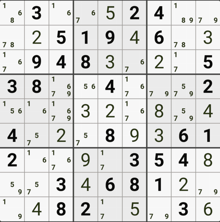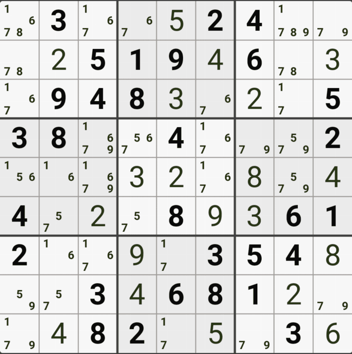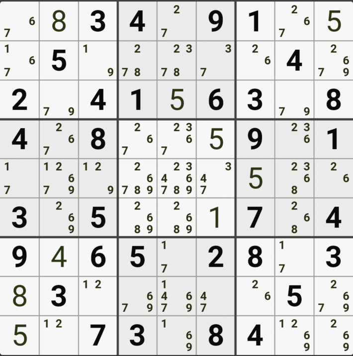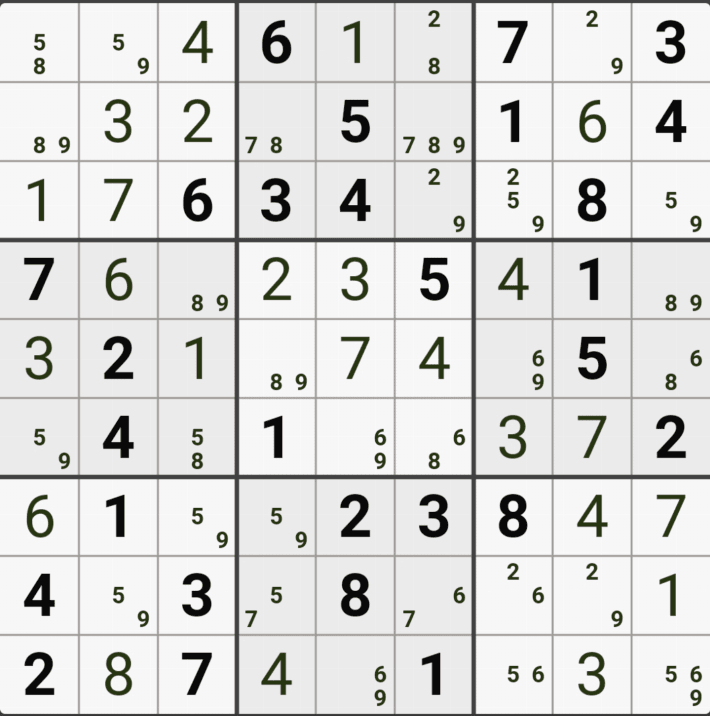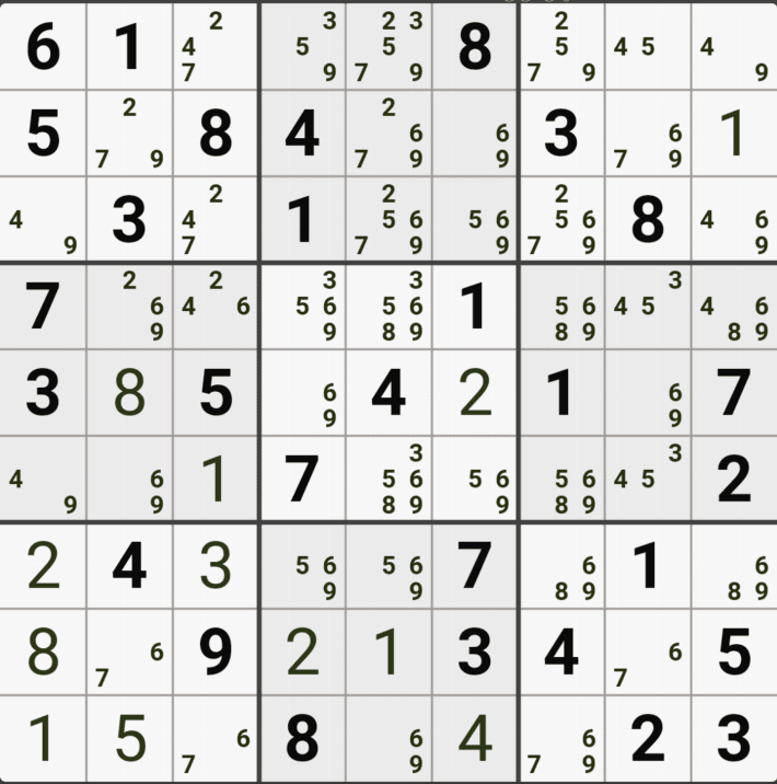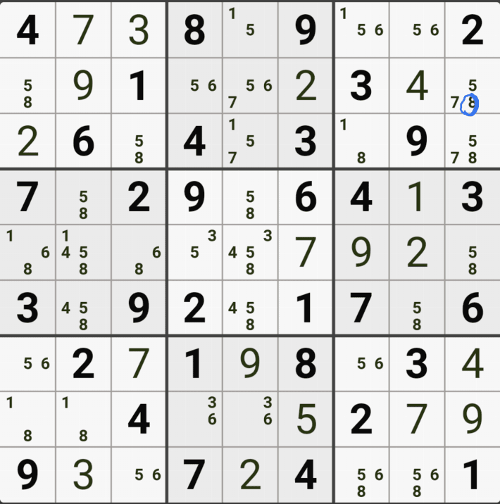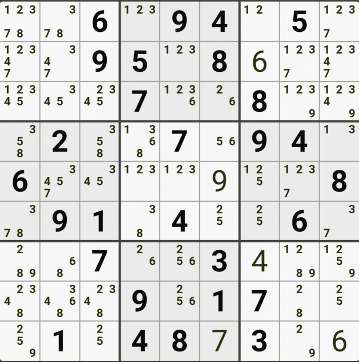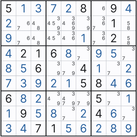 스도쿠 기술이 초급에 머물러 있는 스린이(=스도쿠 어린이)인 나는 계속 비슷한 초급 기술만 쓰니까... 스도쿠가 좀 무료해 지고 있던 찰라였는데 아래와 같은 난제가 찾아 왔다. 셀1-67페어, 48페어, 셀2-숨겨진 숫자를 못 찾겠음, 셀3-확정숫자 6은 딱히 힘이 없고 36페어, 58 페어, 셀5-트리플, 셀6-37페어, 셀8은 쿼드러플, 마지막 셀9-37페어.....