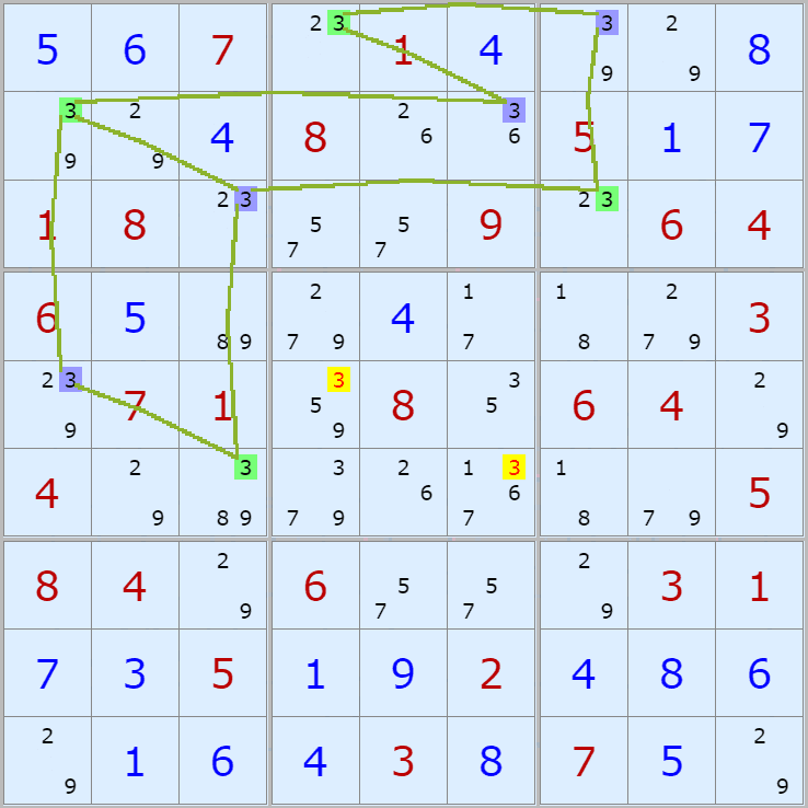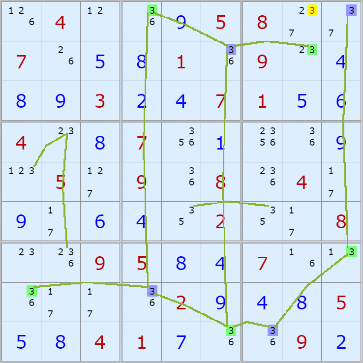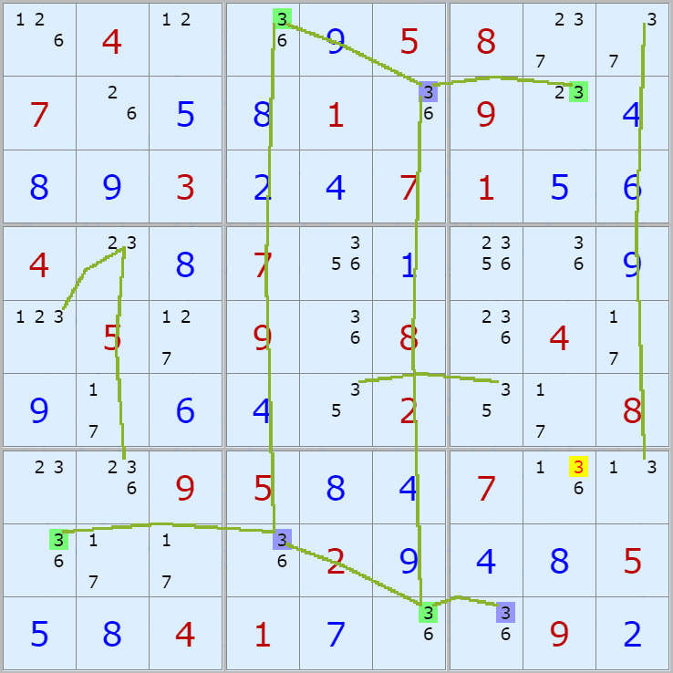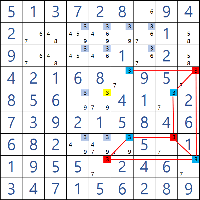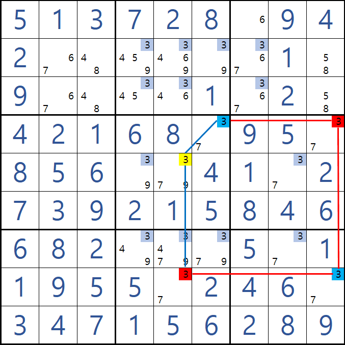 위와 같은 싱글 체인 풀이법을 읽는 방법은 간단하다. 노란색(=제거 될 후보숫자)과 가까운 파란색이 스타트 지점이고 파랑(off) > 빨강(on) > 파랑 > 빨간색(끝점)으로 파랑과 빨강이 마주 보는 칸의 후보숫자가 제거 된다로 이해 하면 되겠다. 그래서 글로 (3,5)칸의 후보숫자 뭐는 ..... 같은 긴 설명이 필요 없다. 위의 그림과 같이 시작점과 끝점이 마주보는 3을 지울 수 있다. 정도면 모두 알 수 있기 때문이다.