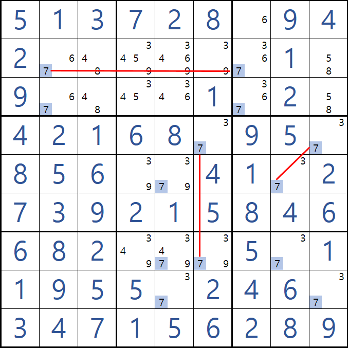 (7,7) 칸에 있는 후보숫자 2를 1개 제거할 수 있다.