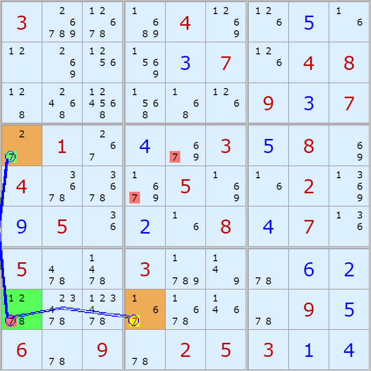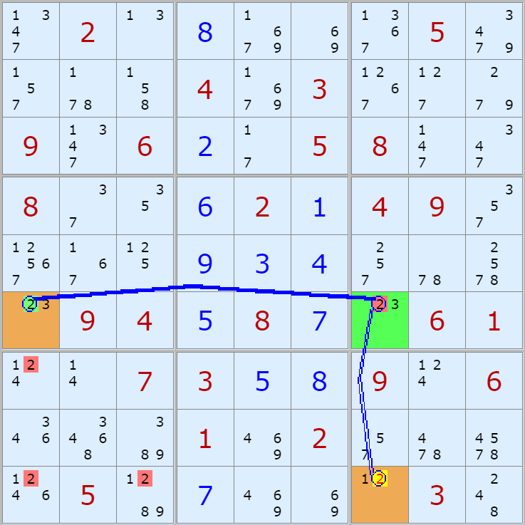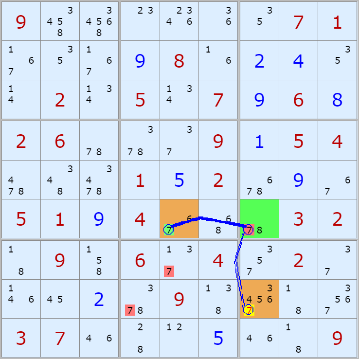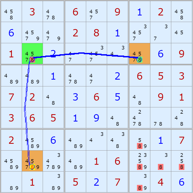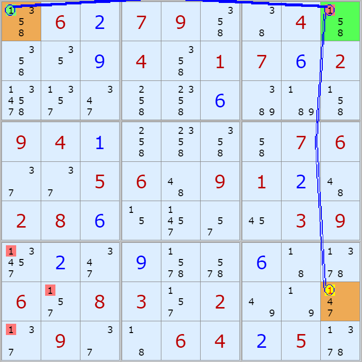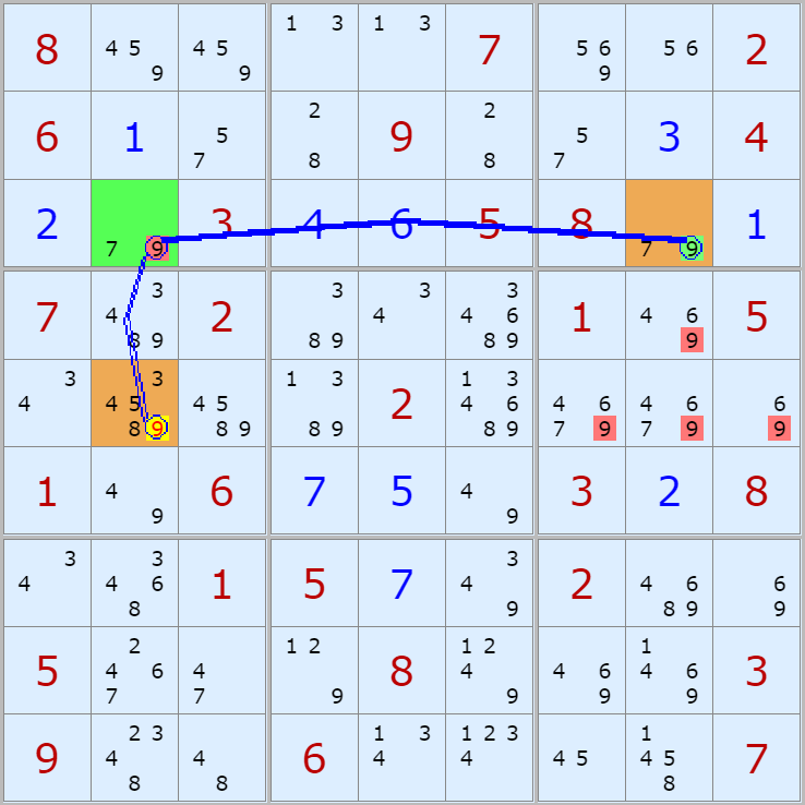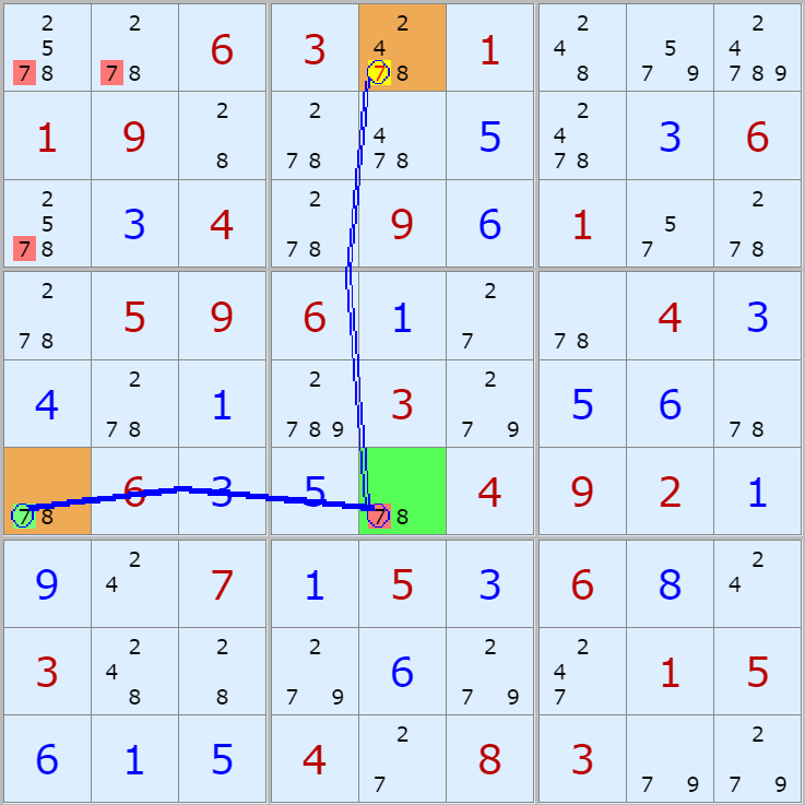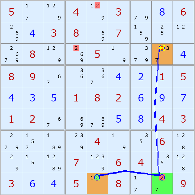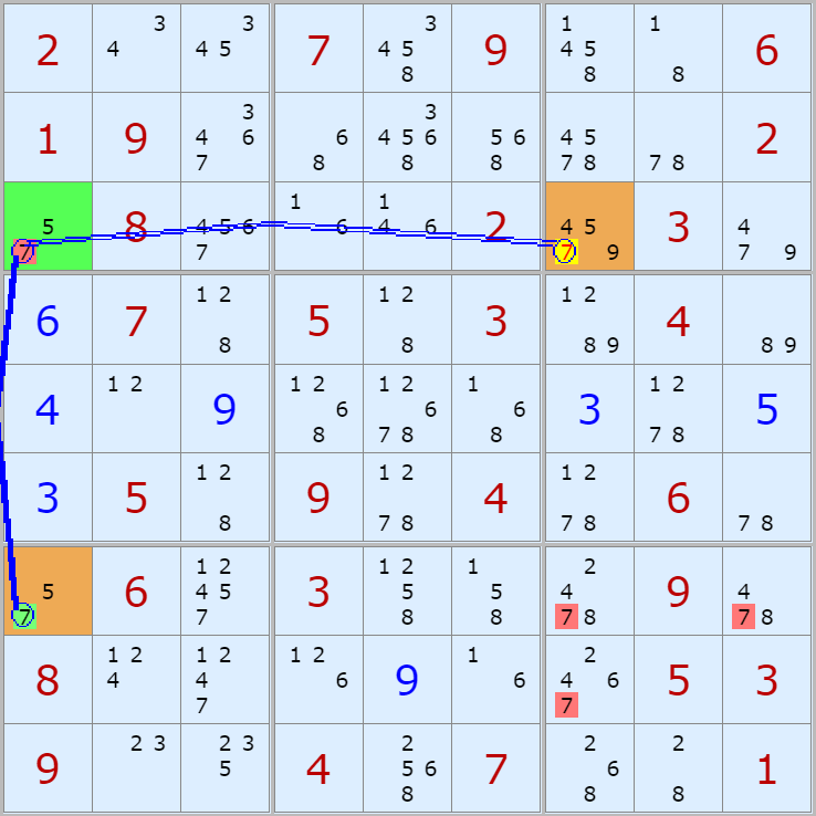 그러면 동시에 끝점(1,3)과 (7,2)의 후보숫자 9가 제거 되는 경우가 생긴다.