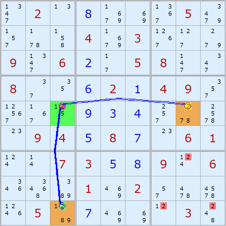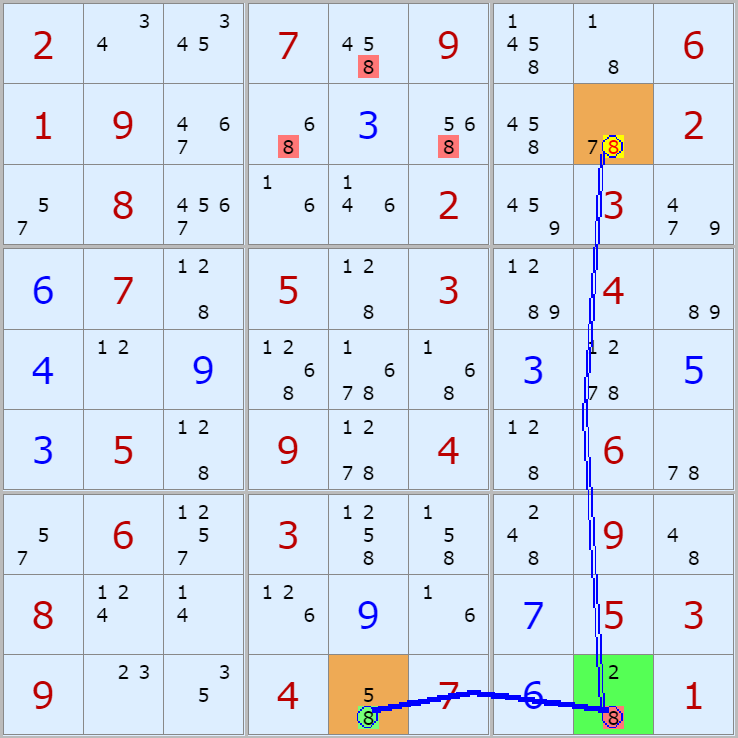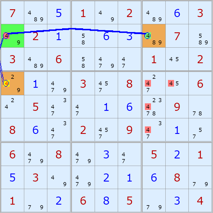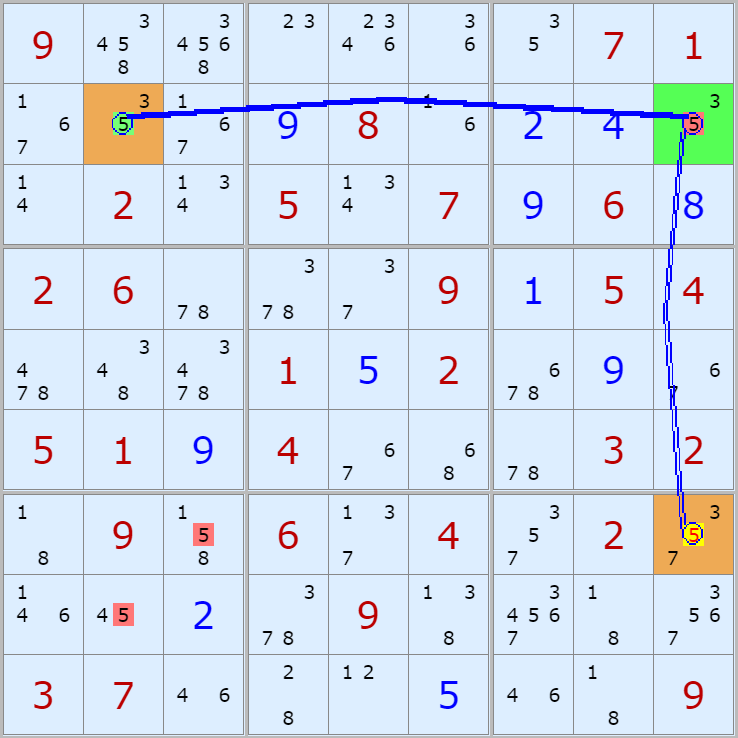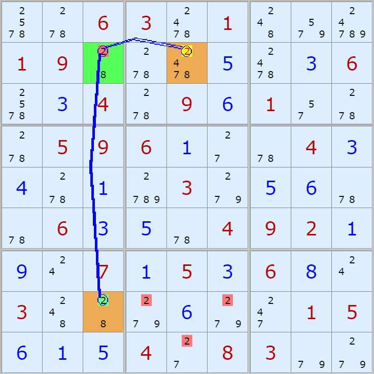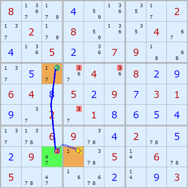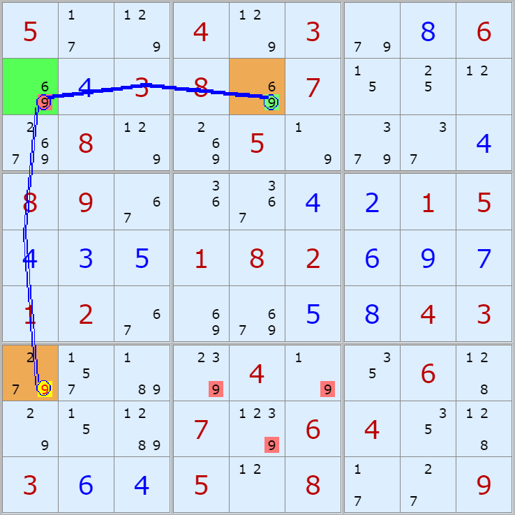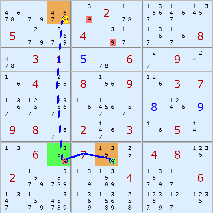 그러면 동시에 끝점(1,3)과 (7,2)의 후보숫자 9가 제거 되는 경우가 생긴다.