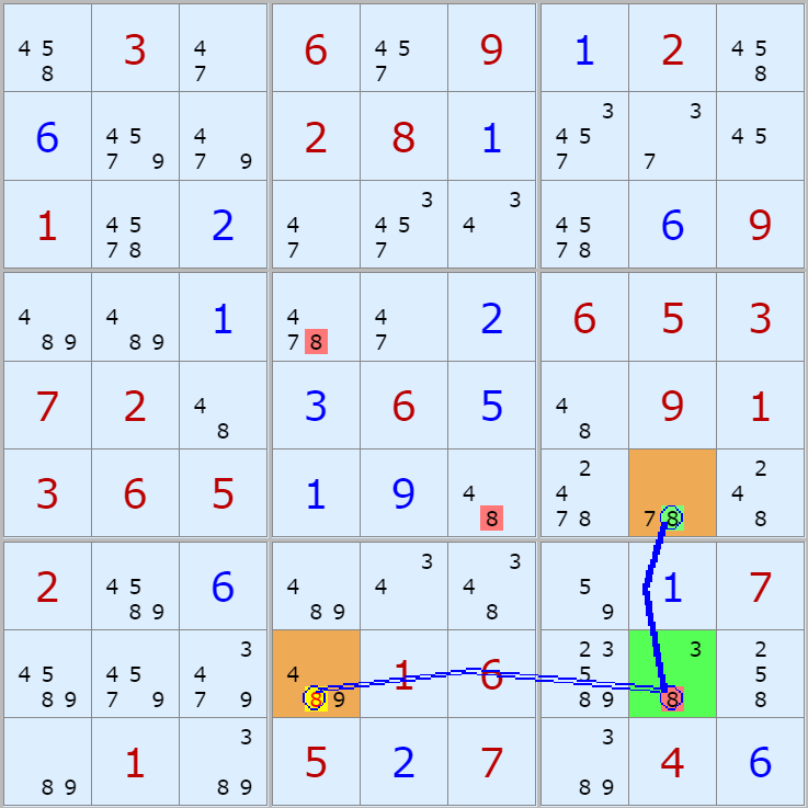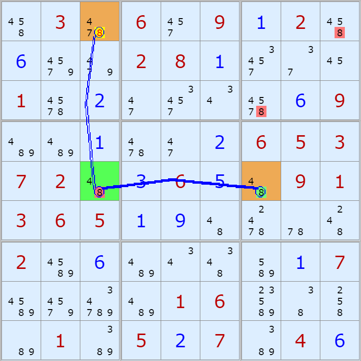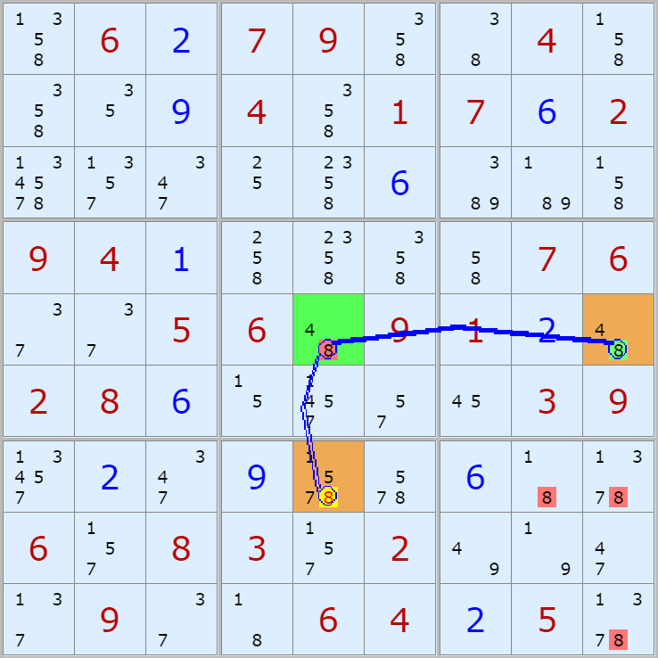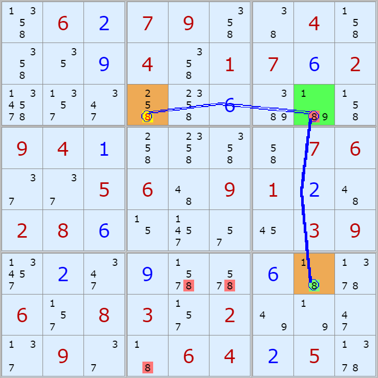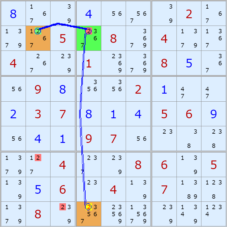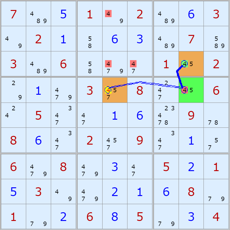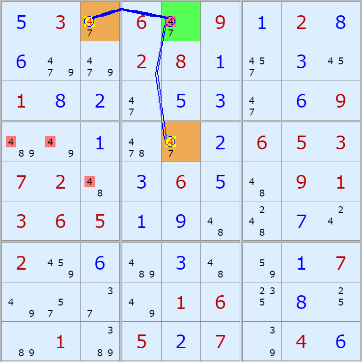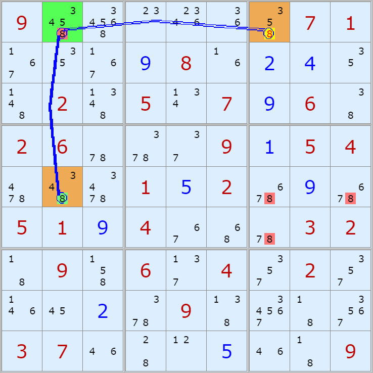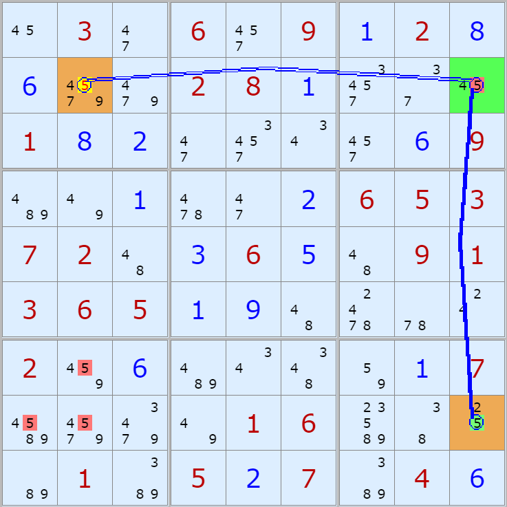 그러면 동시에 끝점(1,3)과 (7,2)의 후보숫자 9가 제거 되는 경우가 생긴다.