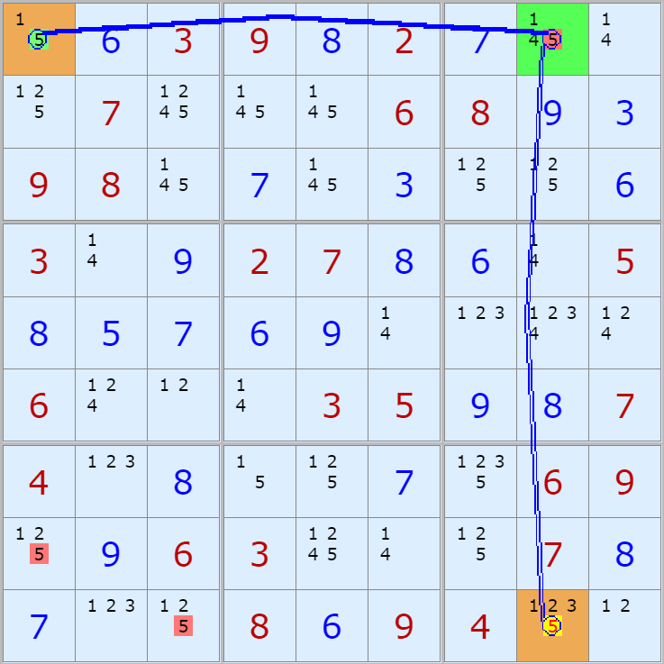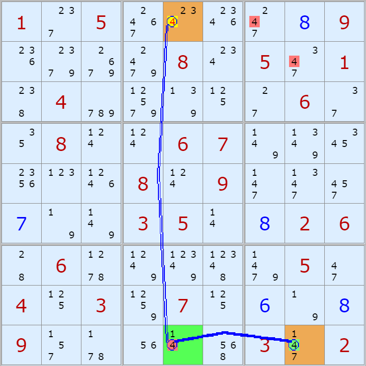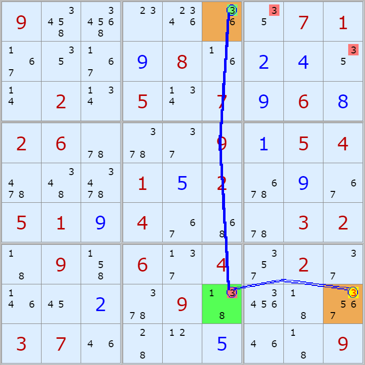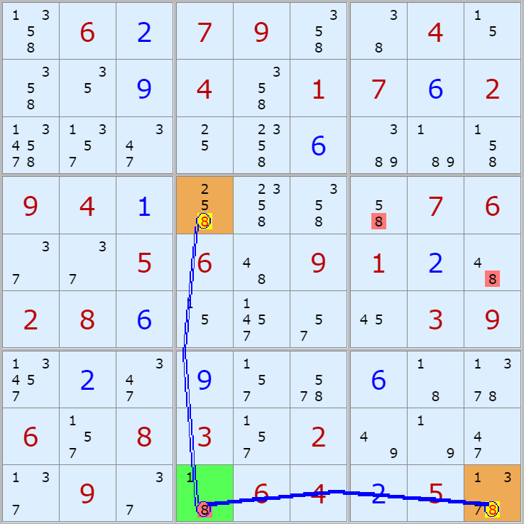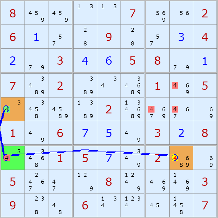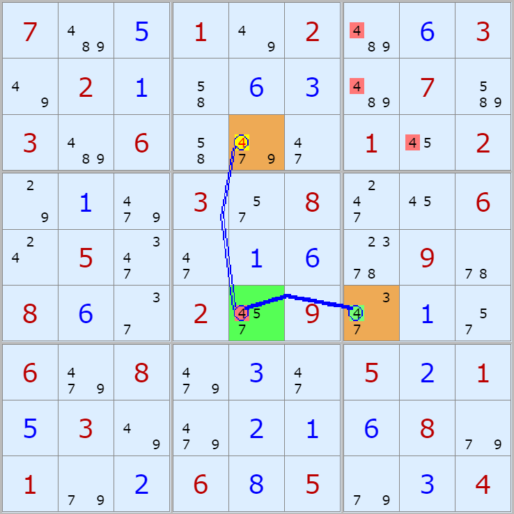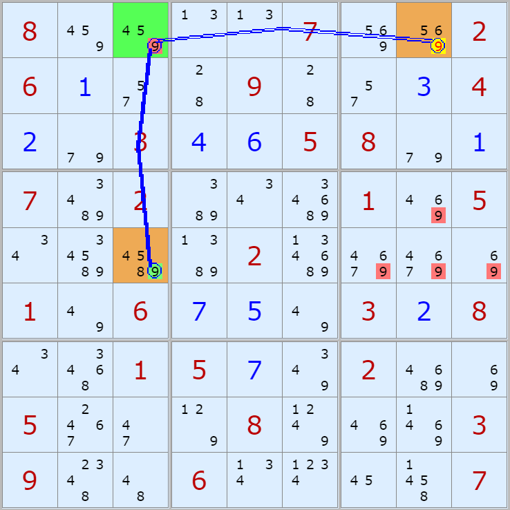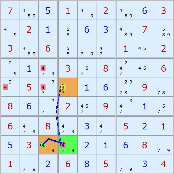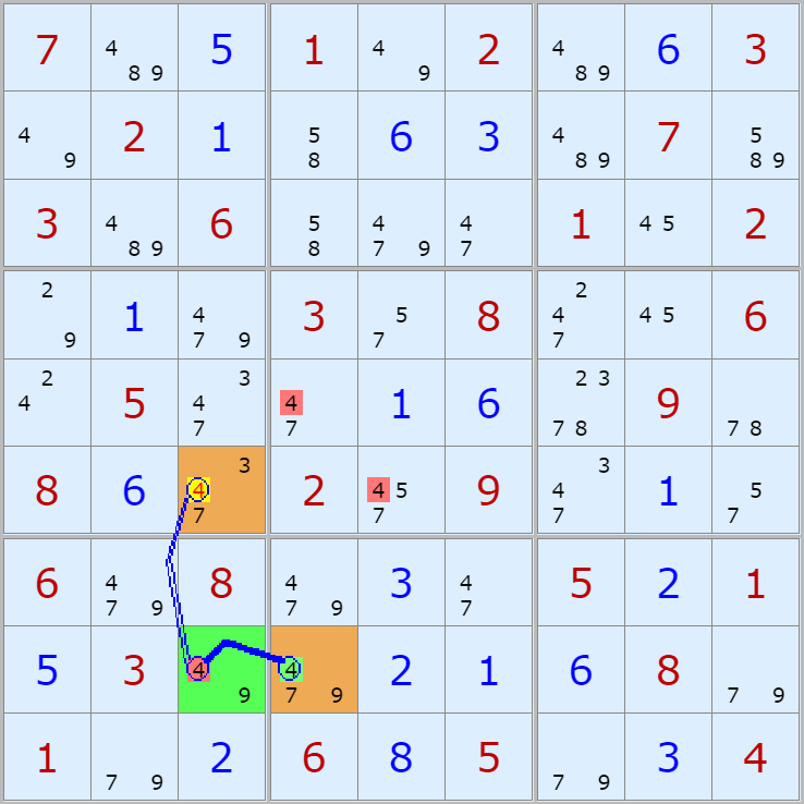 그러면 동시에 끝점(1,3)과 (7,2)의 후보숫자 9가 제거 되는 경우가 생긴다.