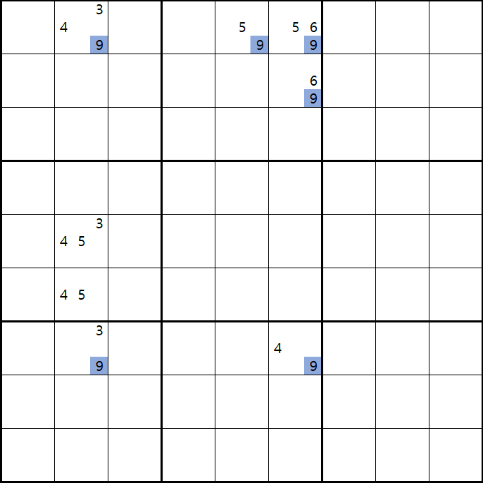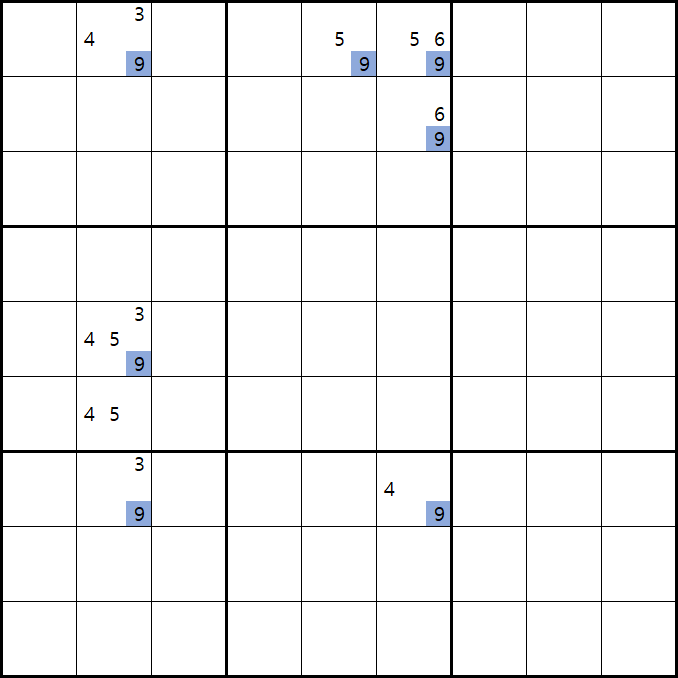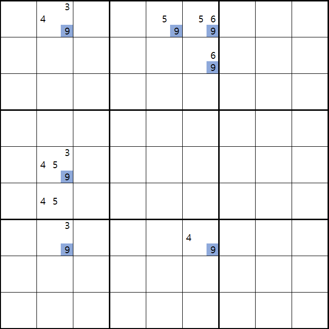 다만 셀2에 존재하는 후보숫자 9 세칸은 특정할 수 없다.